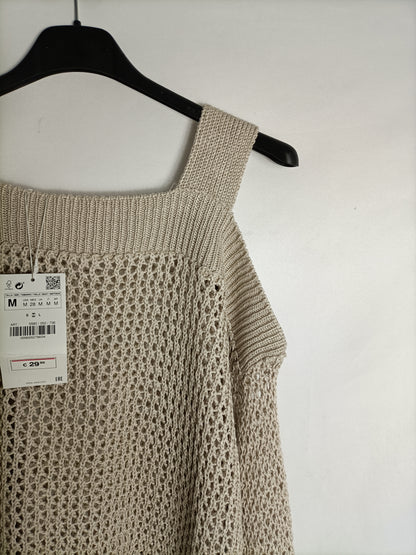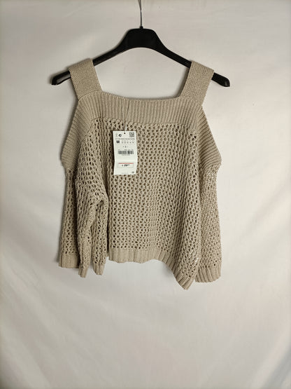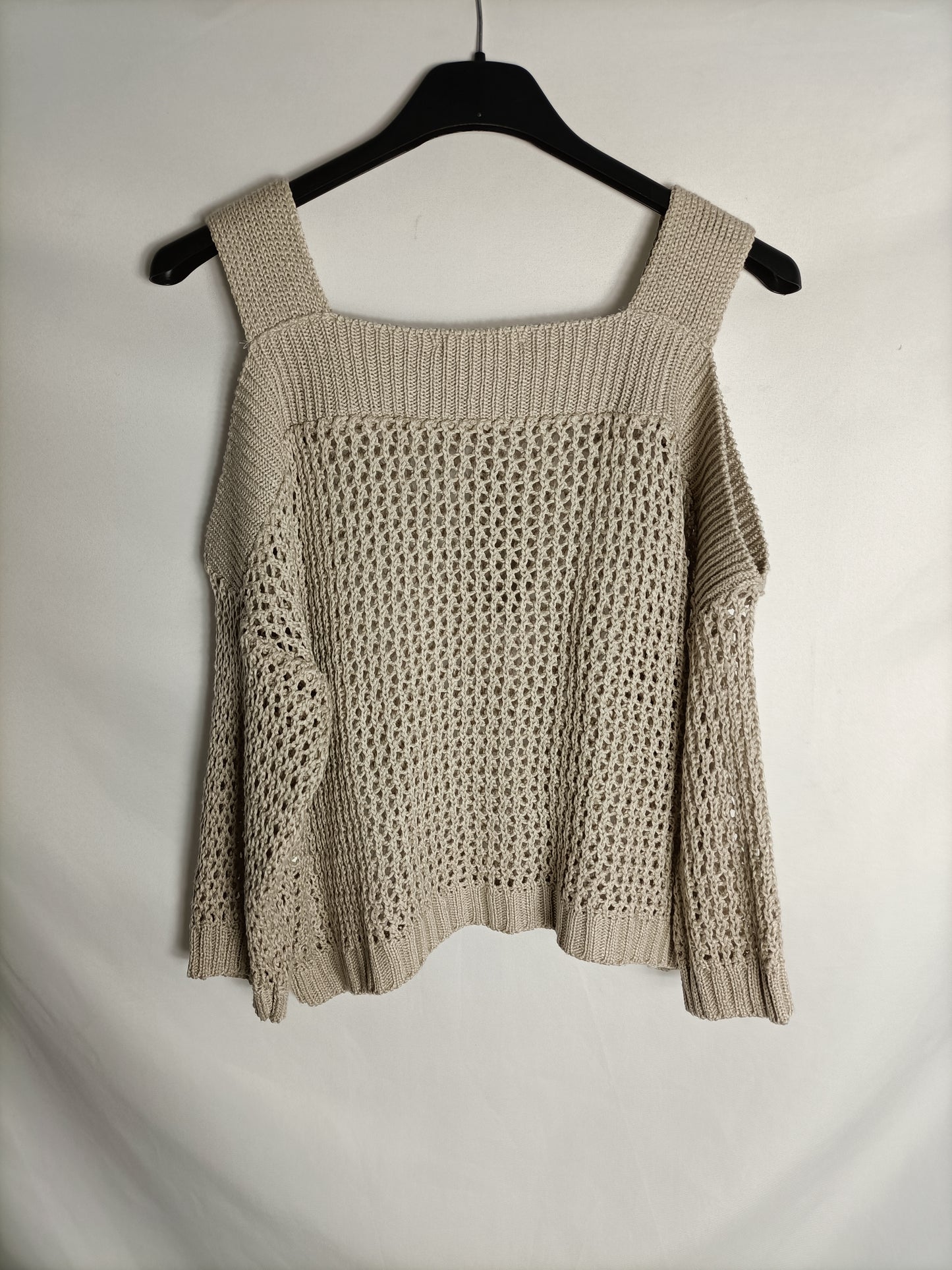 NUEVO CON ETIQUETA. Top beige de punto abierto de tirantes y mangas con hombros al aire