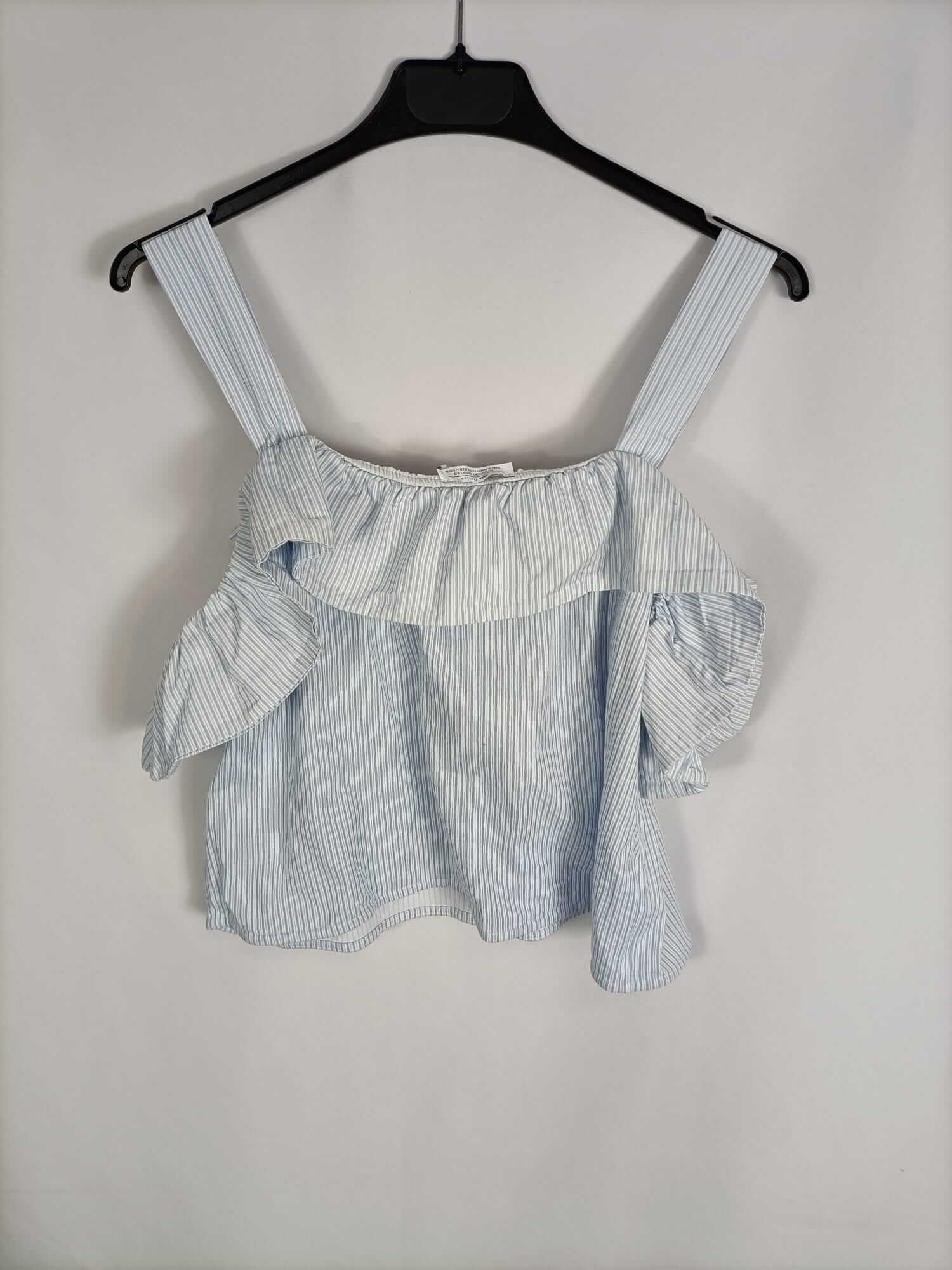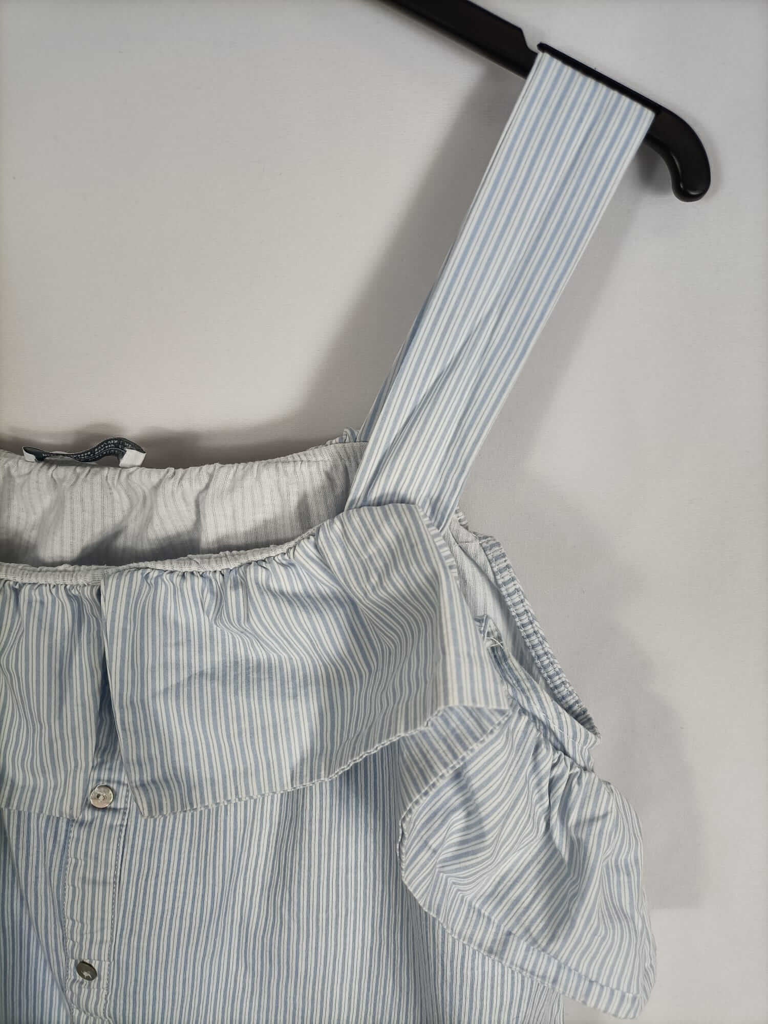 Top de rayas celeste y blanco con tirantes y mangas con el hombro al aire. Elástico. Largo 50 cm de