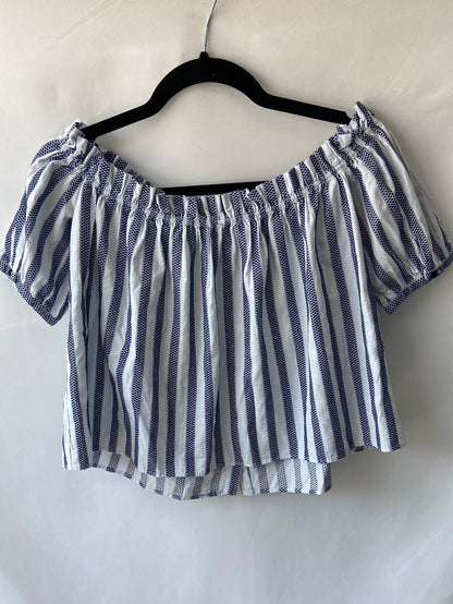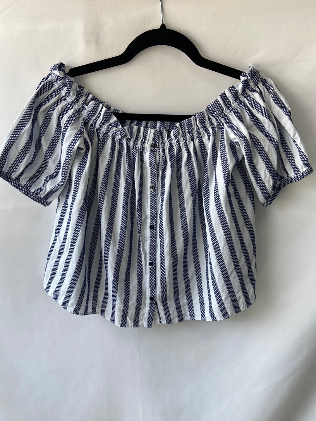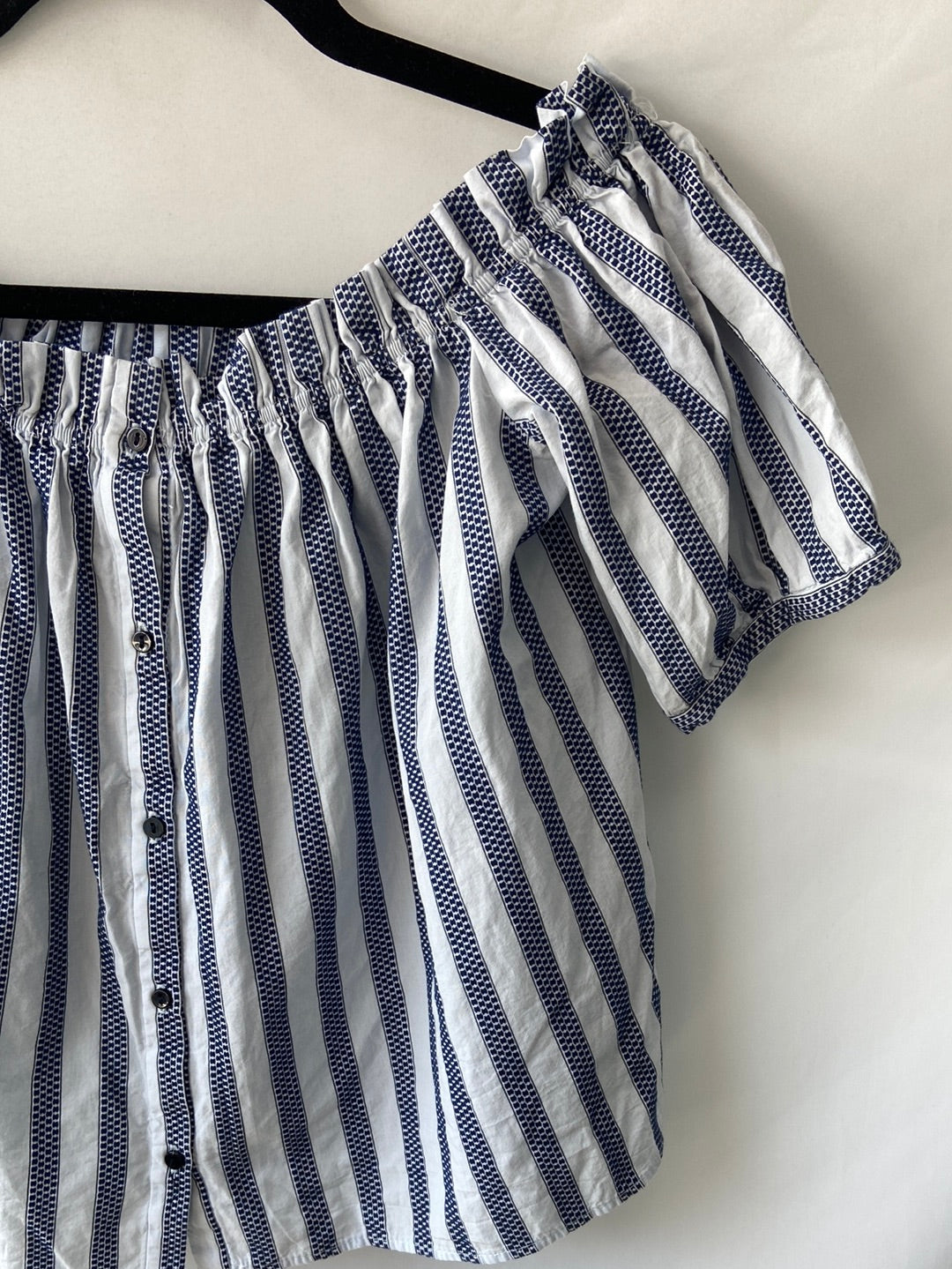 Top de rayas azules con el cuello barco con elástico. Es abotonada por delante