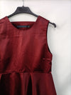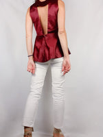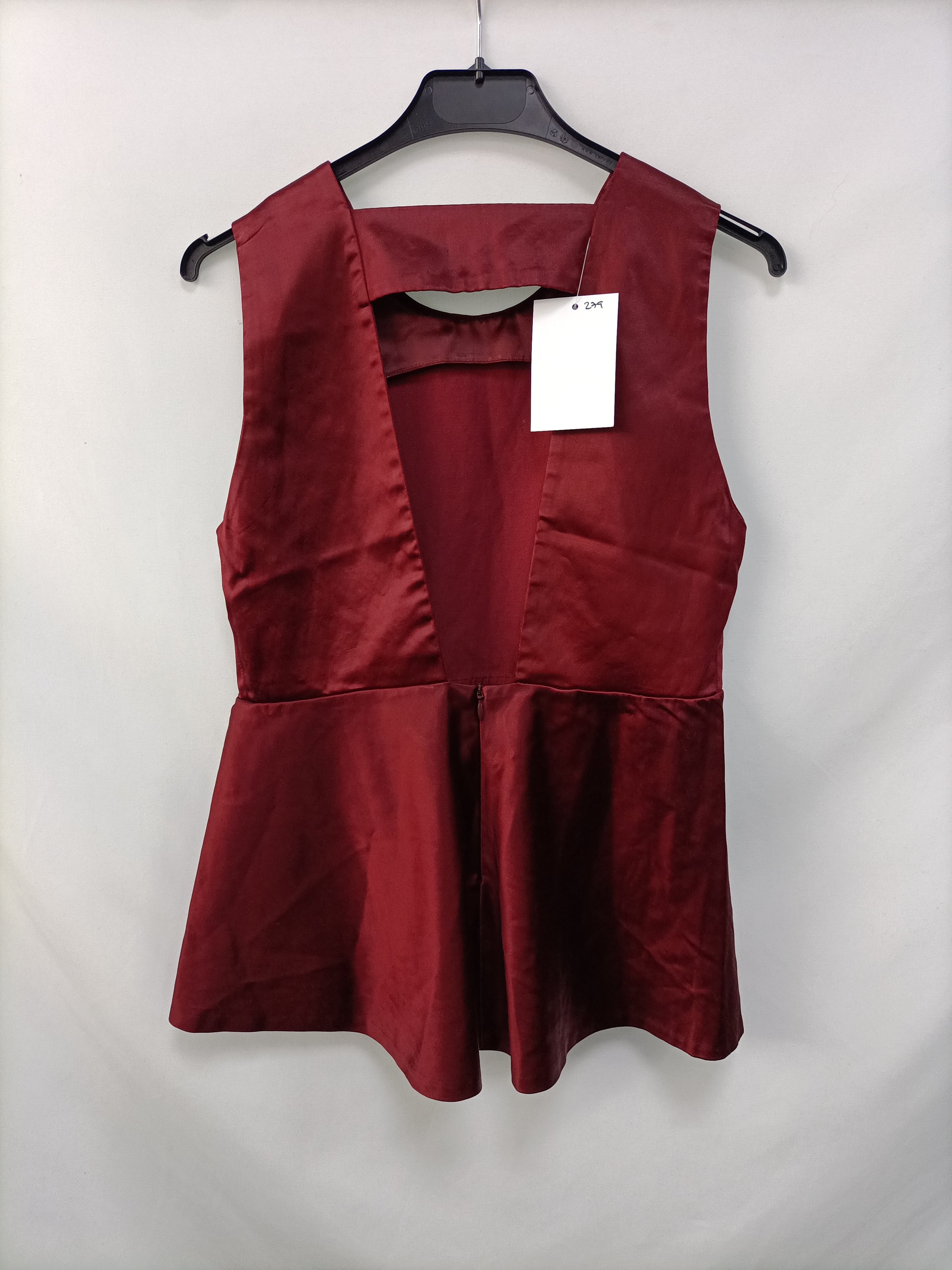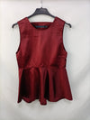 Blusa burdeos de tejido satinado con ña espalda al aire y cremallera. Acaba en volante y no es elástica. De sisa a sisa 37 cm largo 59 cm