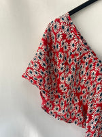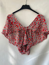 Top rojos con flores con la espalda al aire. No elástico. Cremallera lateral. Manga estilo murciélago. Largo 49 cm
