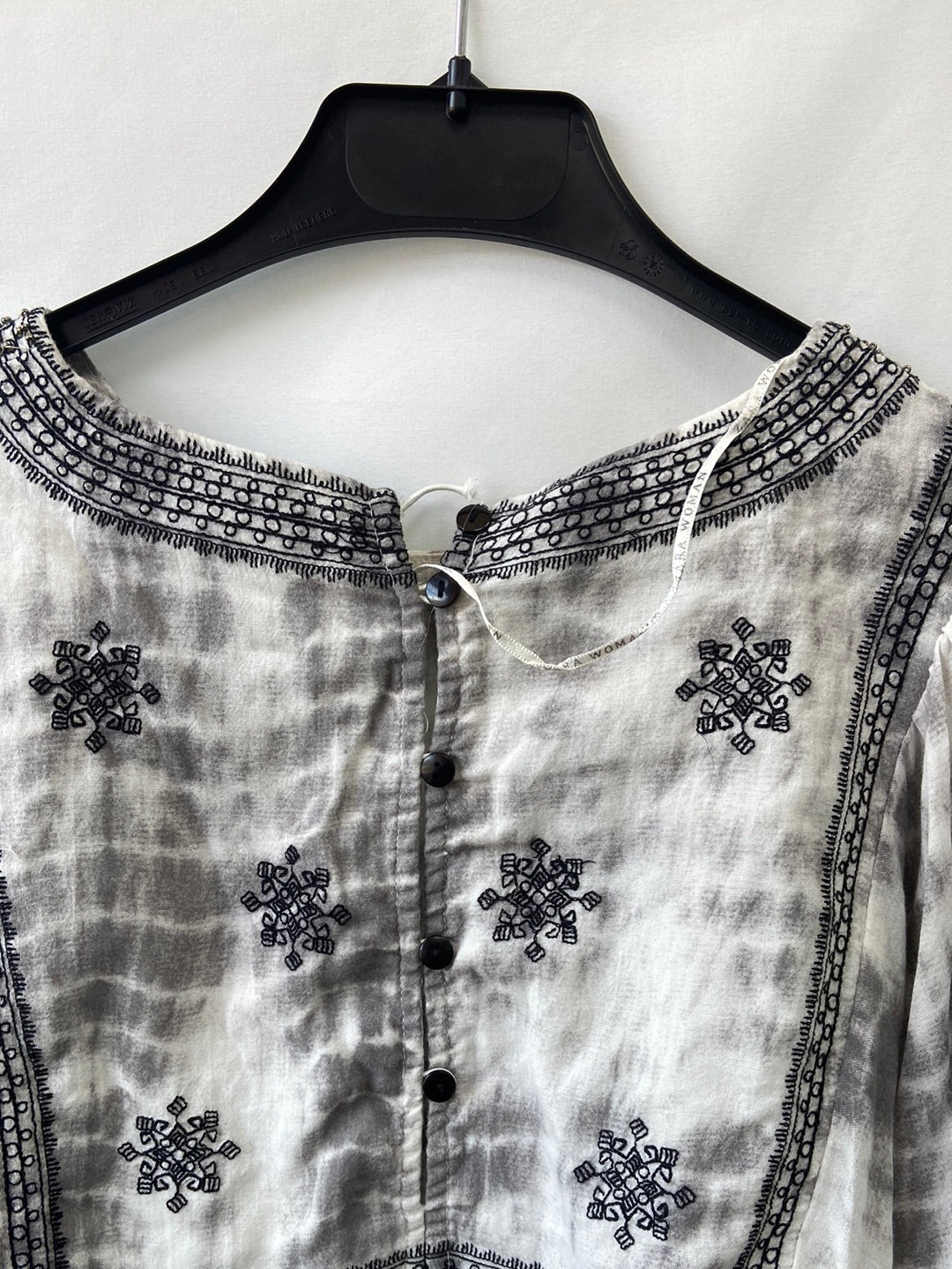 blusa algodón fluida estampado tie dye abalorios. Mangas abullonadas. No elástica. Sisa murciélago largo 69 cm . Ojal descosido