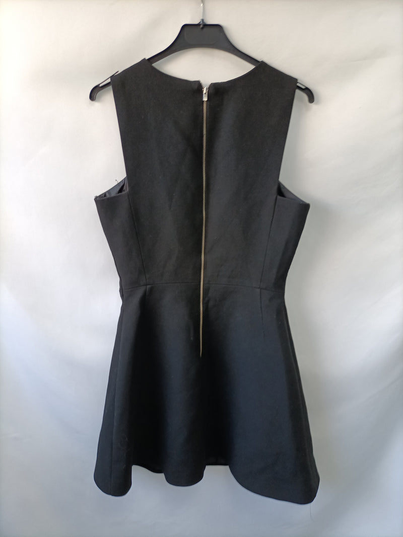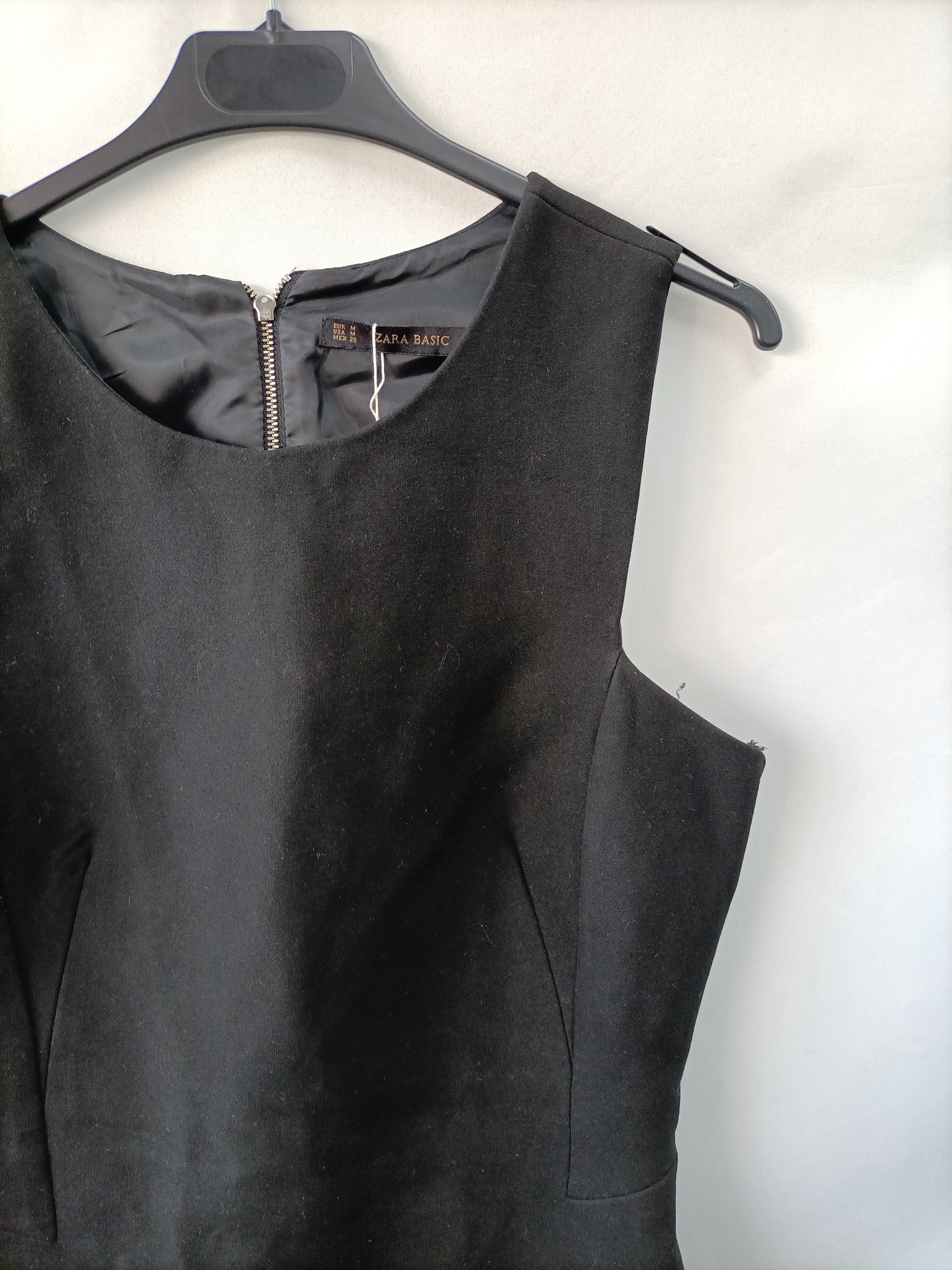 Vestido negro sin mangas, ajustado en el pecho y con vuelo en la falda. De sisa a sisa 42 cm, largo 80 cm