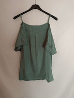 top verde agua con detalle bordado central y tirantes con hombro al aire.