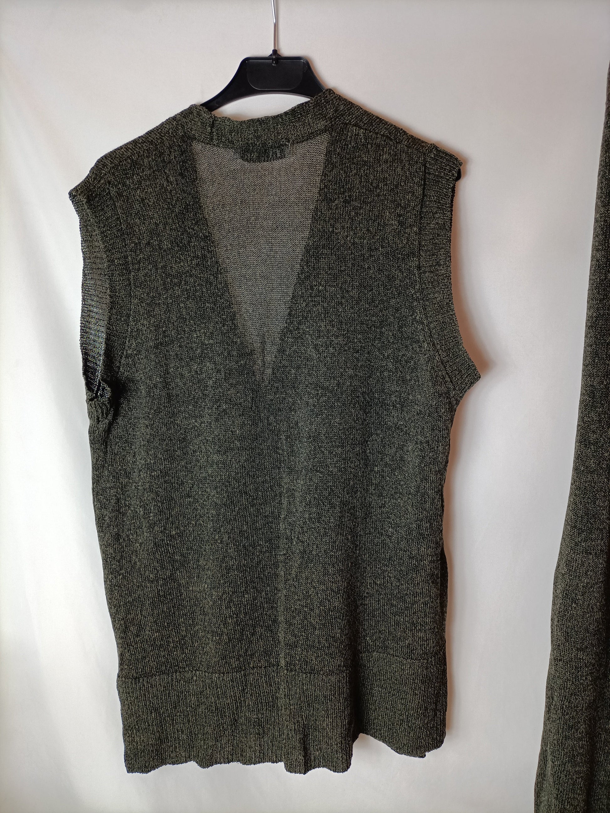 Total look chaleco abotonado y pantalones culotte en hilo jaspeado (marrón y gris). El tejido