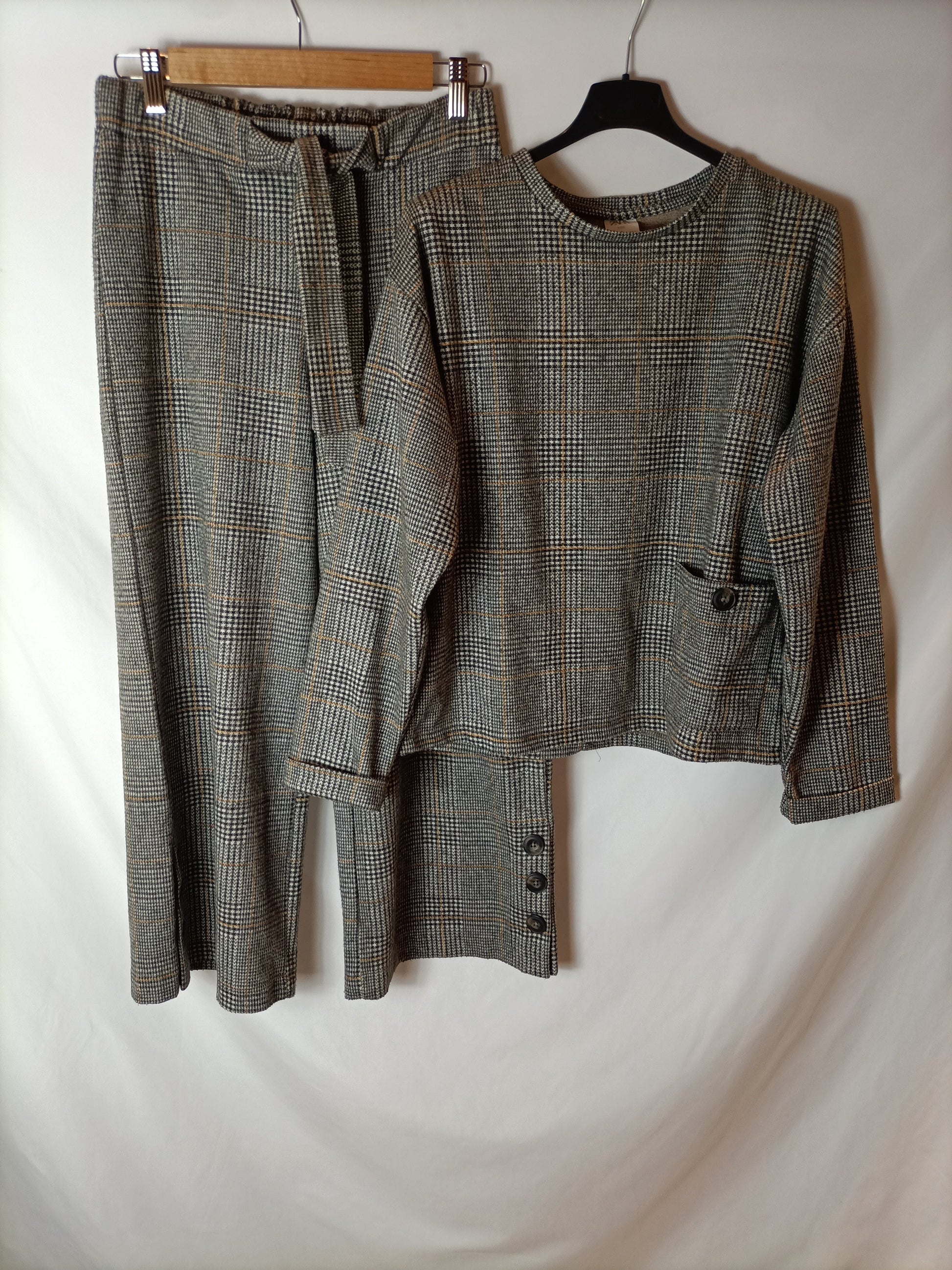 total look de punto elástico de pata de gallo en tonos negros y marrones. elástico.