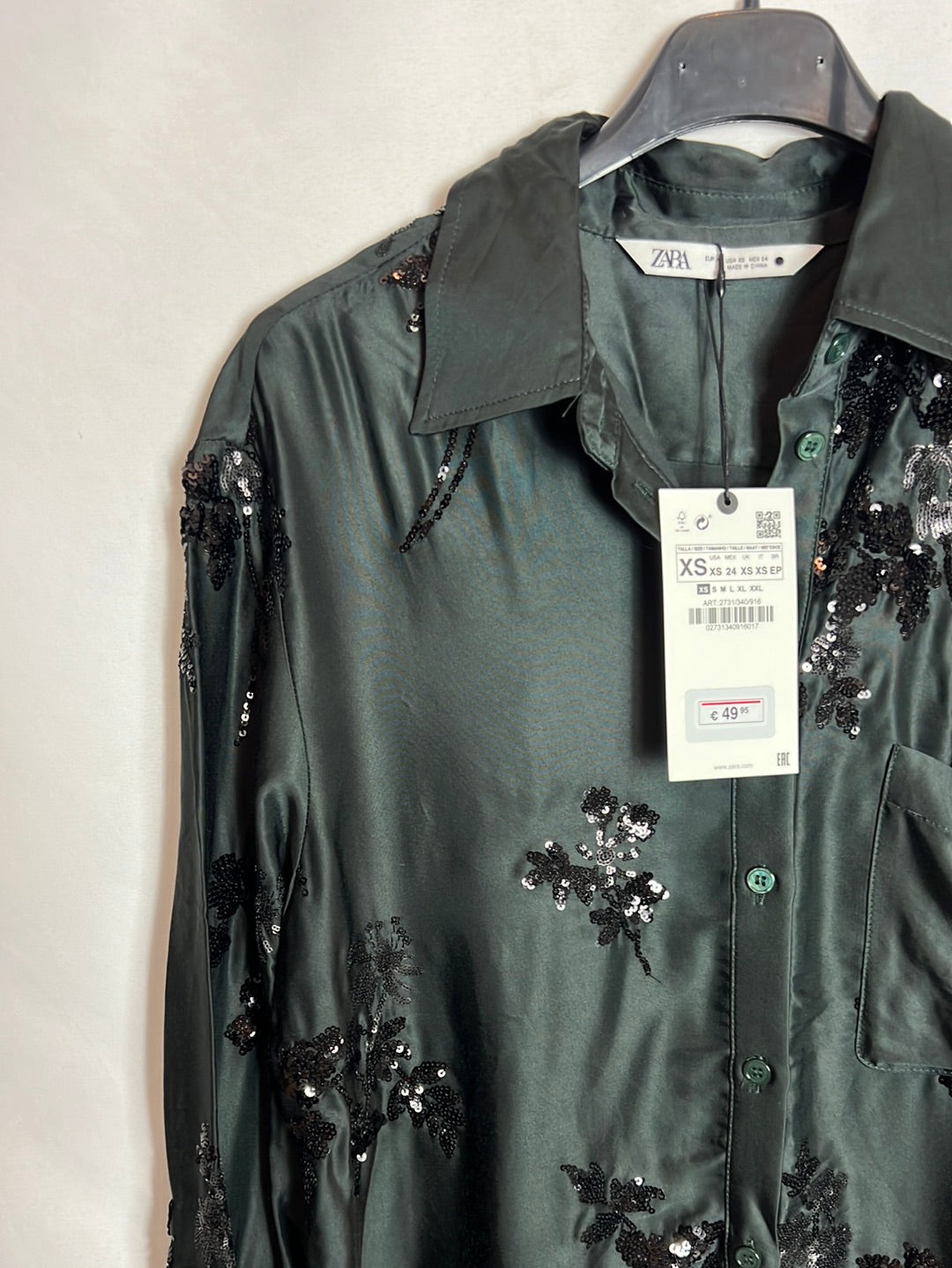 NUEVO CON ETIQUETA. Total look negro verdoso lentejuelas. Blusa de sisa a sisa 60cm, largo 66cm. Pantalon cintura 32cm elástica, largo 105 cm