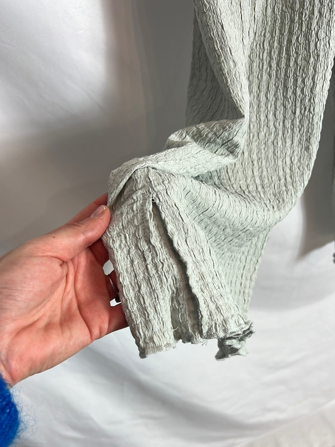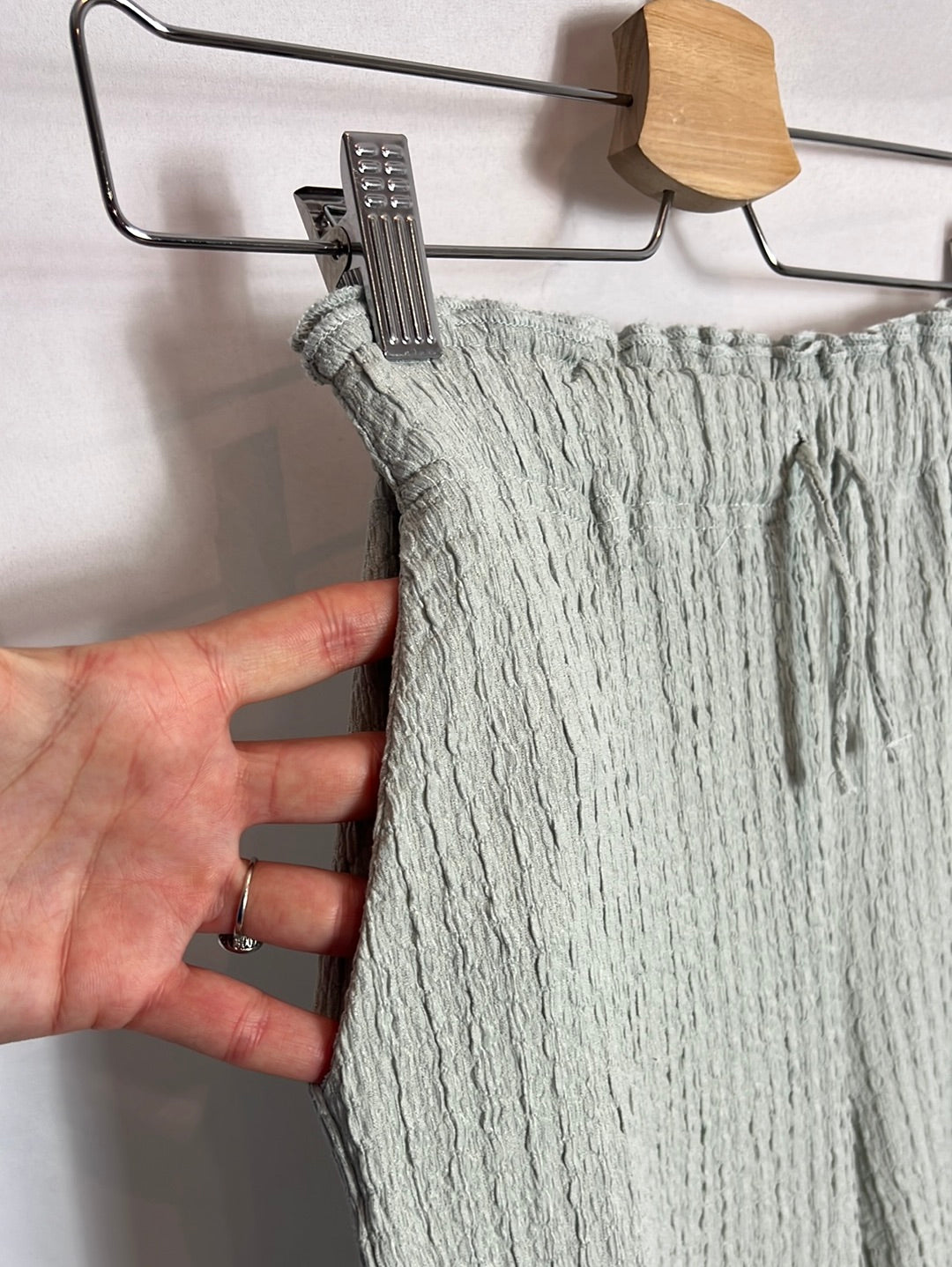 Total look top y pantalón textura azul claro. Elástico. Cintura 30cm elástica, largo 83cm. Tara: mancha en el top (foto) poco perceptible