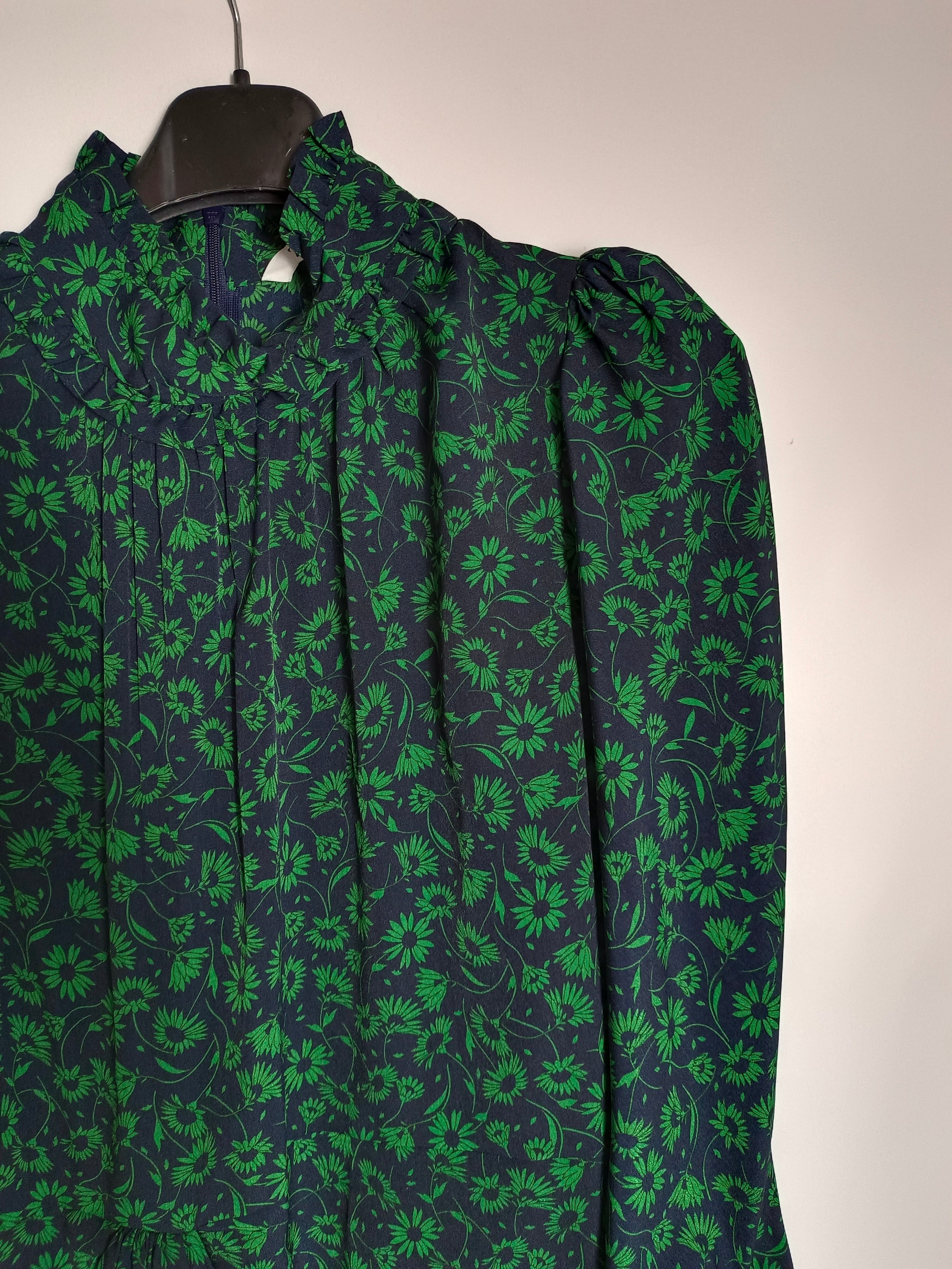 vestido corto azul con flores verdes. Detalles fruncidos. Cuello perkins con mini volante.