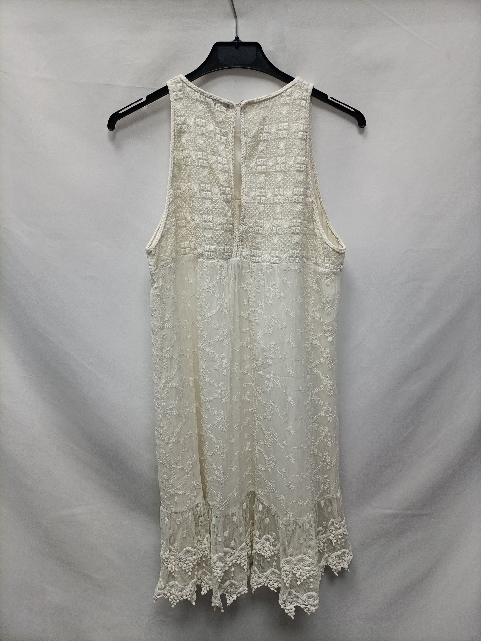 Vestido corto beige de encaje con escote halter. Fluido y no elástico. Mini volante en la parte de abajo. De sisa a sisa 46 cm largo 84 cm.