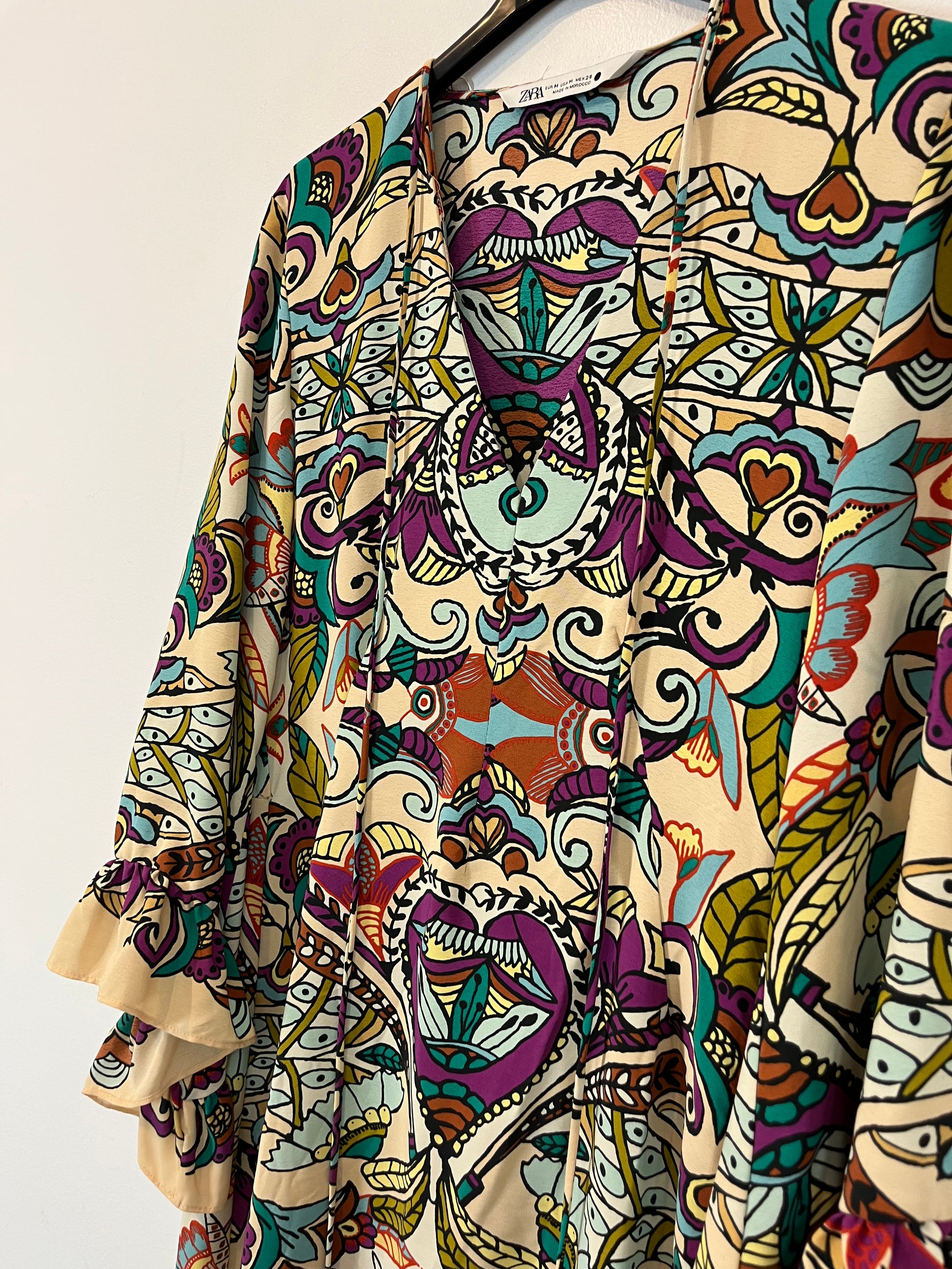 Vestido largo estampado detalle volantes. De sisa a sisa 52 cm, largo 126 cm.
