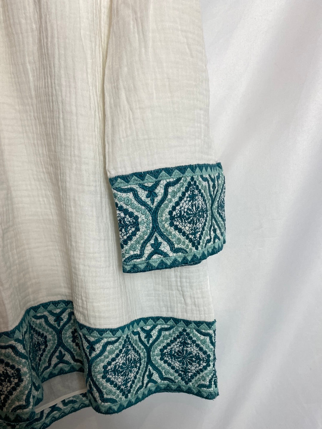 Vestido corto blanco con detalles étnicos. Tejido tipo bambula
