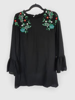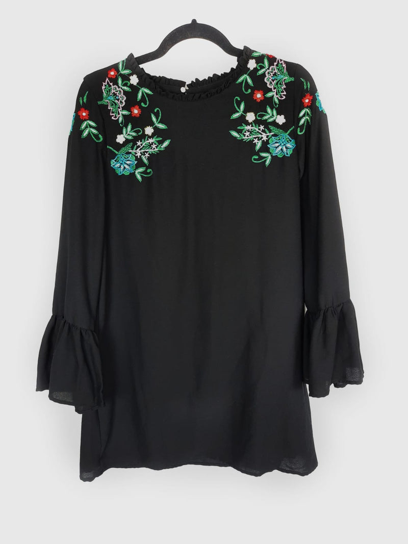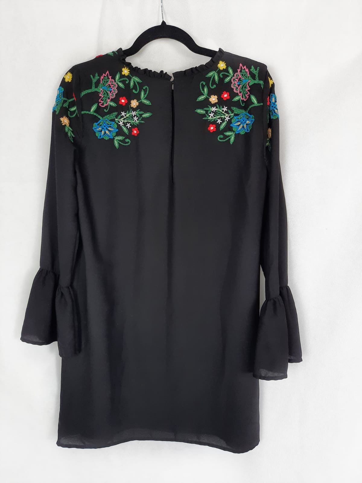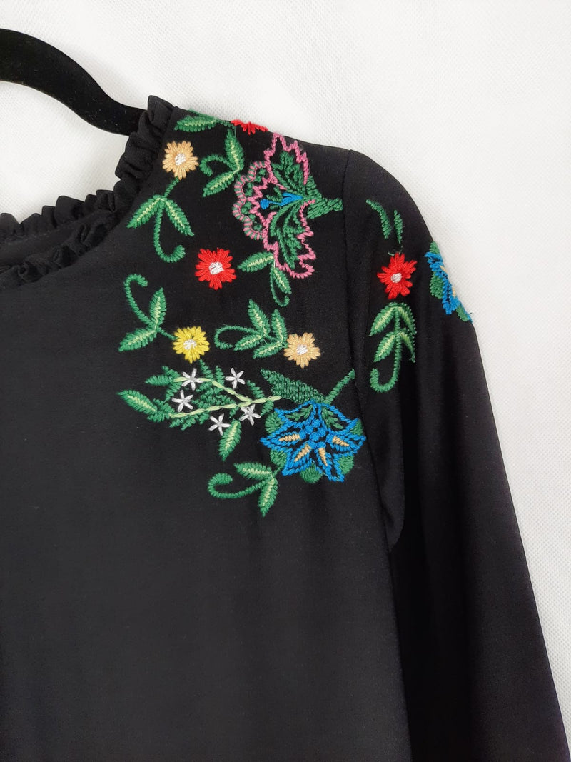 Vestido corto negro con flores bordadas y mangas con volantes. Largo 86 cm