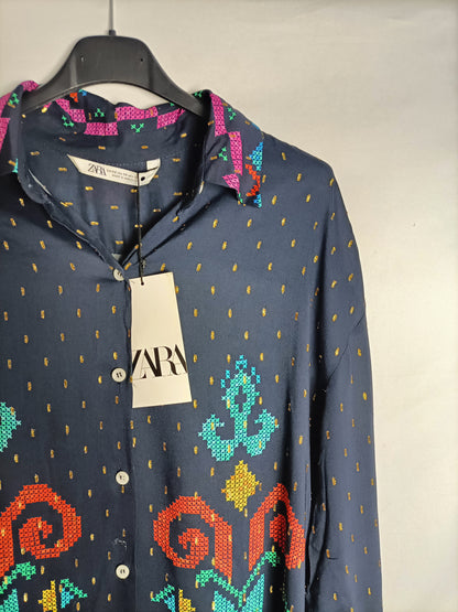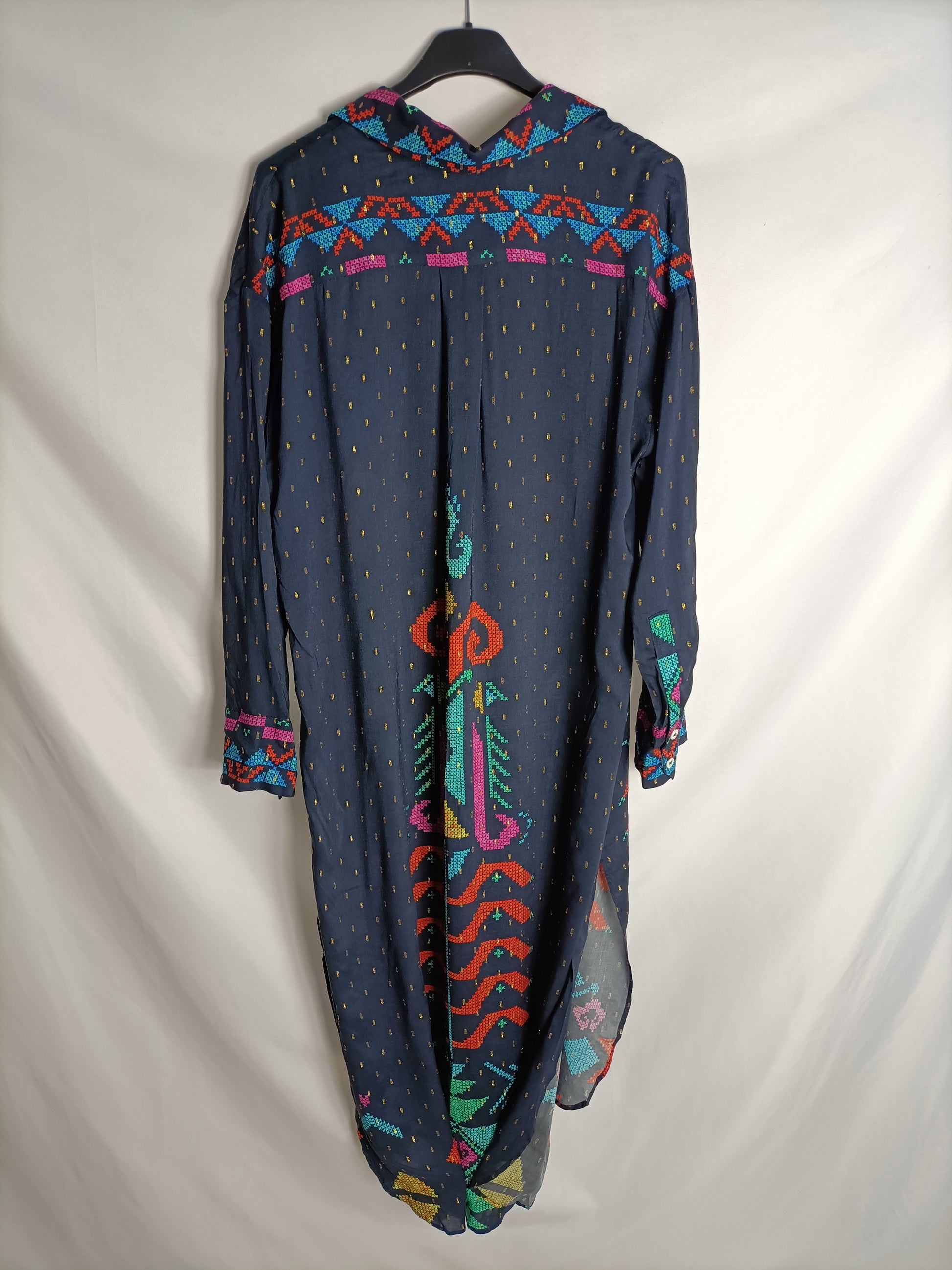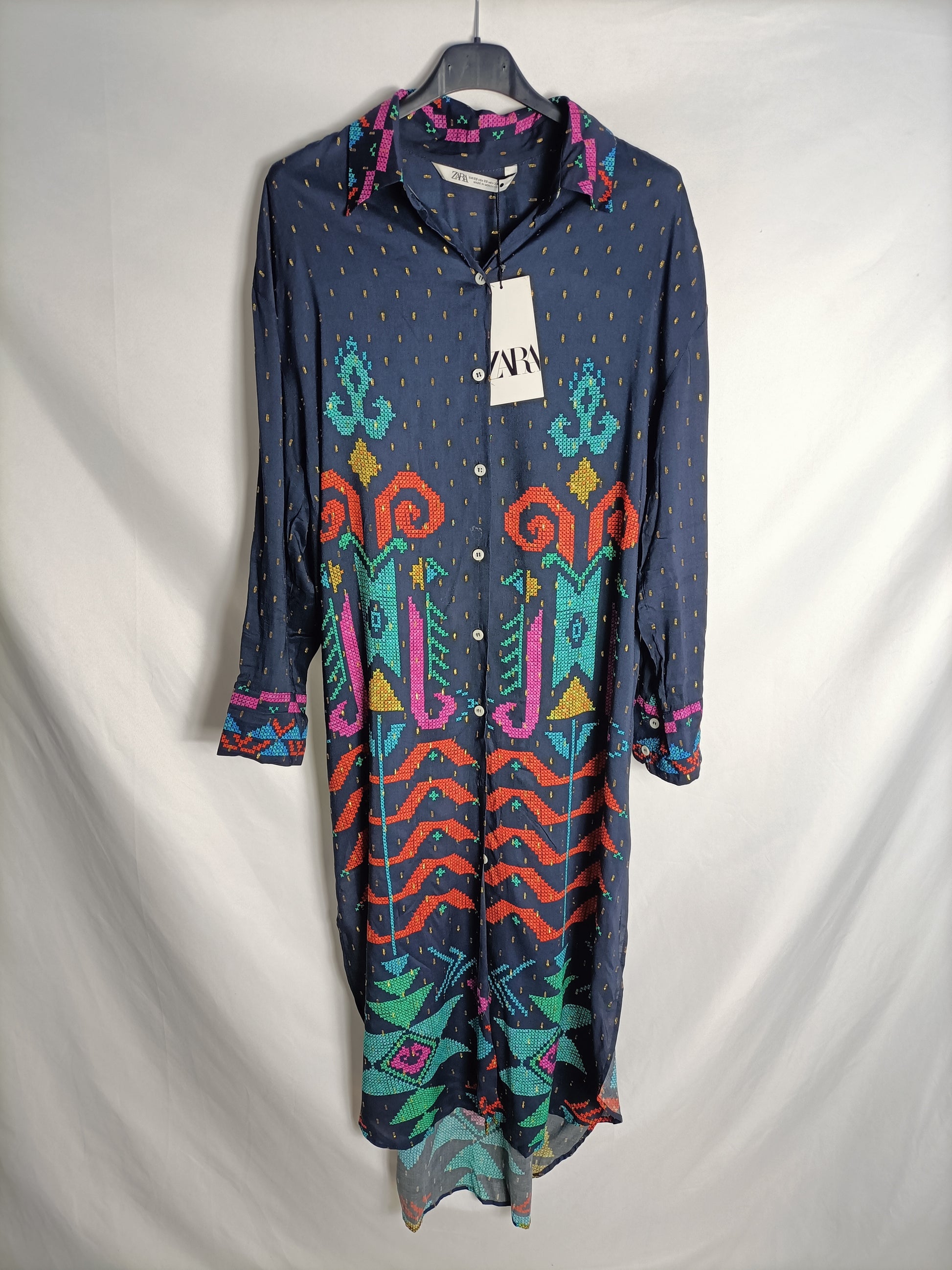 NUEVO CON ETIQUETA. Vestido midi camisero azul con detalles el dorados