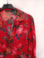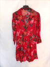 Vestido estilo camisero rojo con flores en tonos verdes. Abotonado. No elástico. De sisa a sisa 46 cm Largo 88 cm