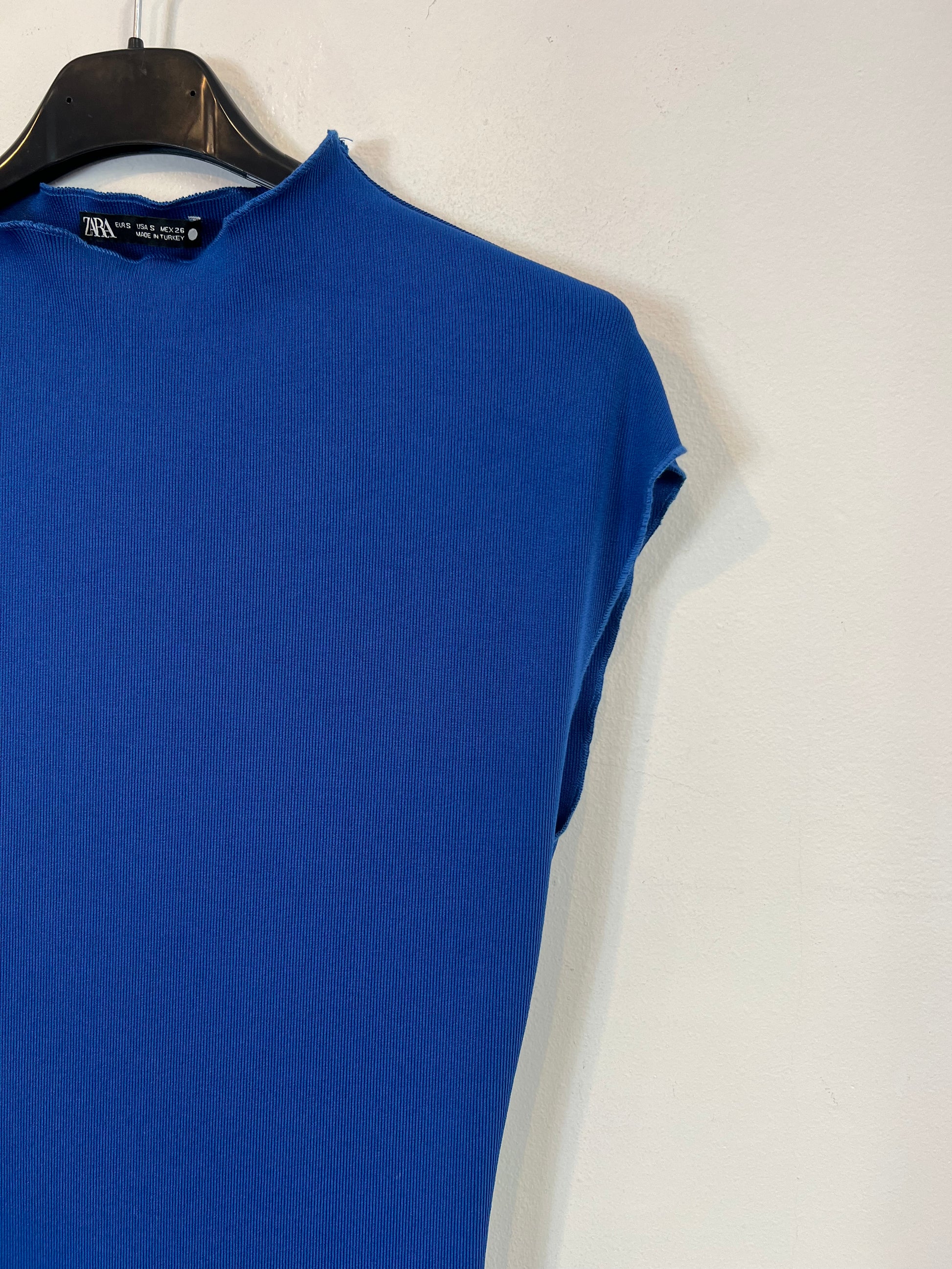 Vestido azul de canalé entallado elástico. Cuello perkins. largo 126 cm.