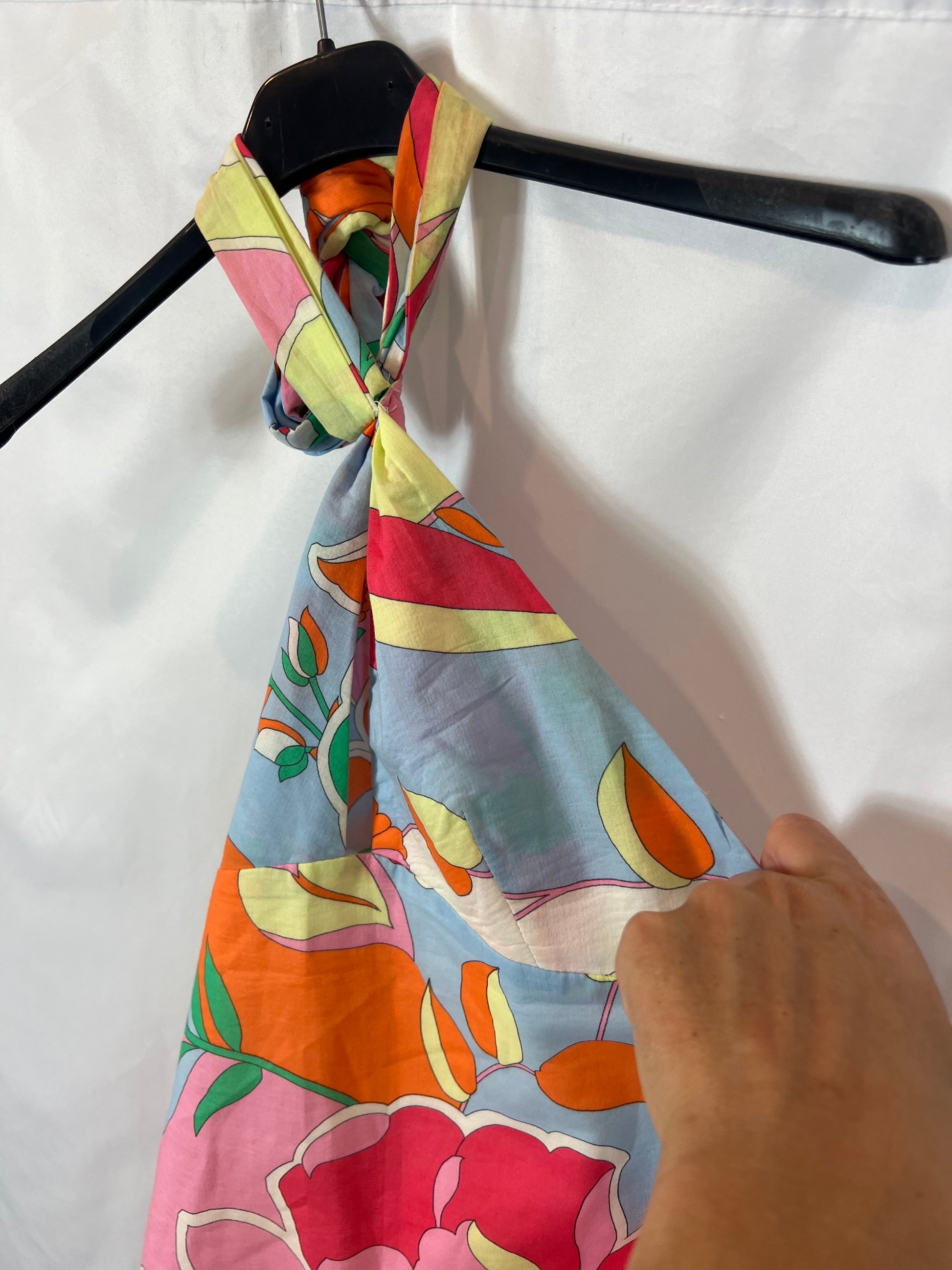 vestido corto estampado de colores atado al cuello y espalda al aire. No elástico