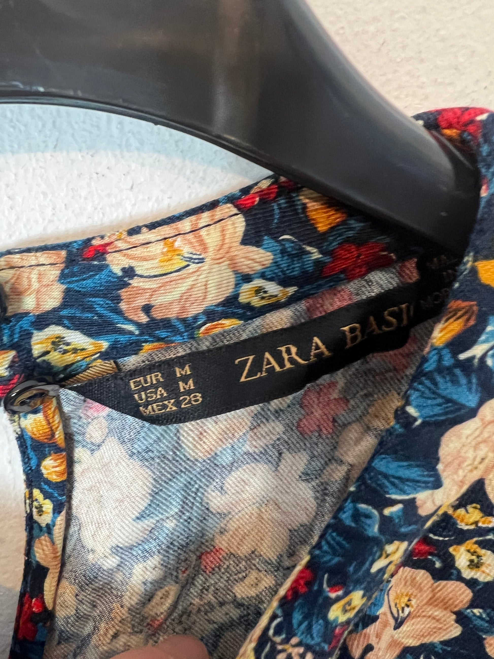 Vestido corto azul con estampado de flores. Detalle de lazada en el cuello. de sisa a sisa 48 cm largo 86 cm