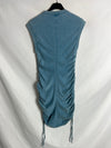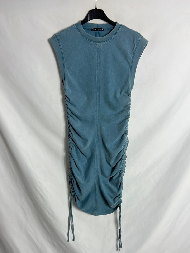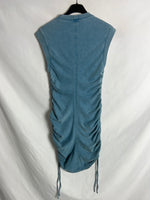 Vestido corto azul fruncidos. Tejido muy poco elástico. Largo 88cm