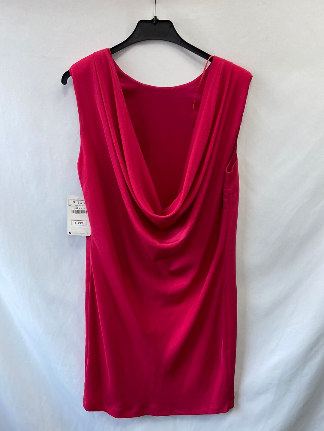 NUEVO CON ETIQUETA.Vestido corto algo satinado con espalda baja fluida. Hombreras. No elástico. Largo 90 cm
