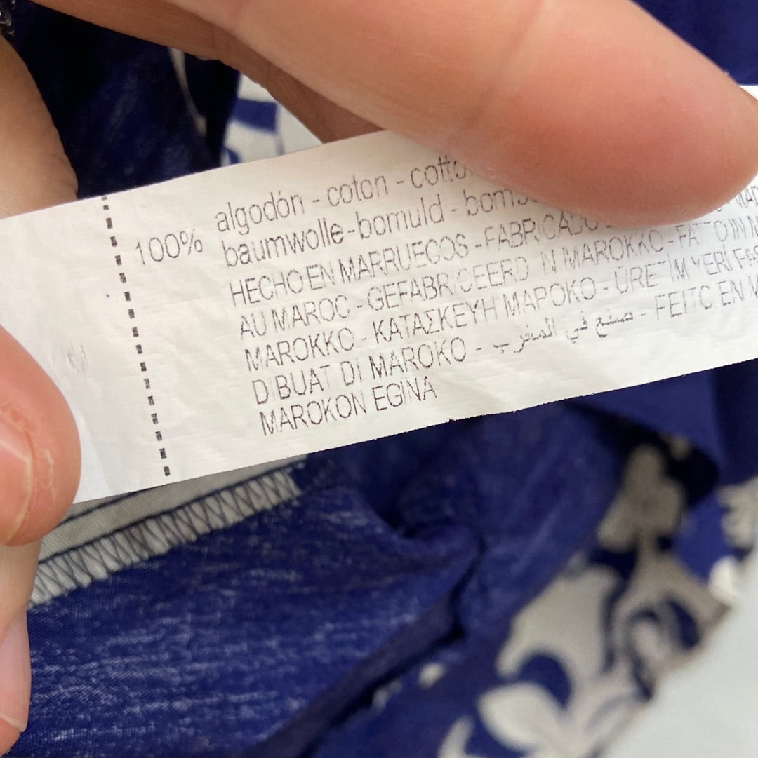 Vestido camisero azul con estampado veis abotonado hasta abajo con detalle de volante no es elástico y tiene cinturón. Largo 85 cm