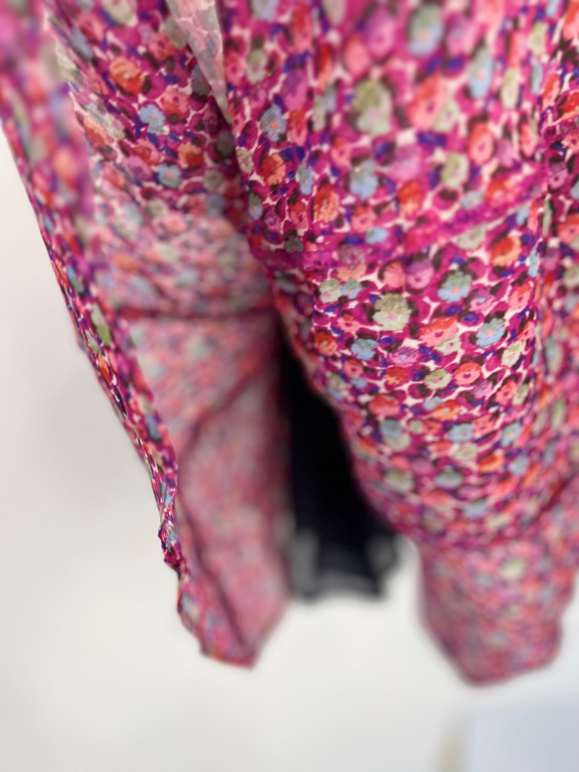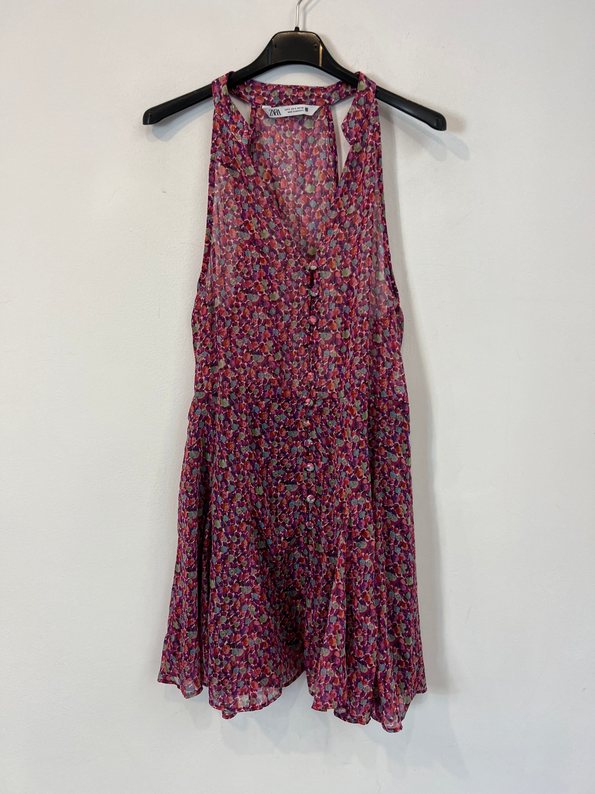 Vestido corto fluido estampado de flores. Detalle de hilos dorados. Escote semitransparente.
