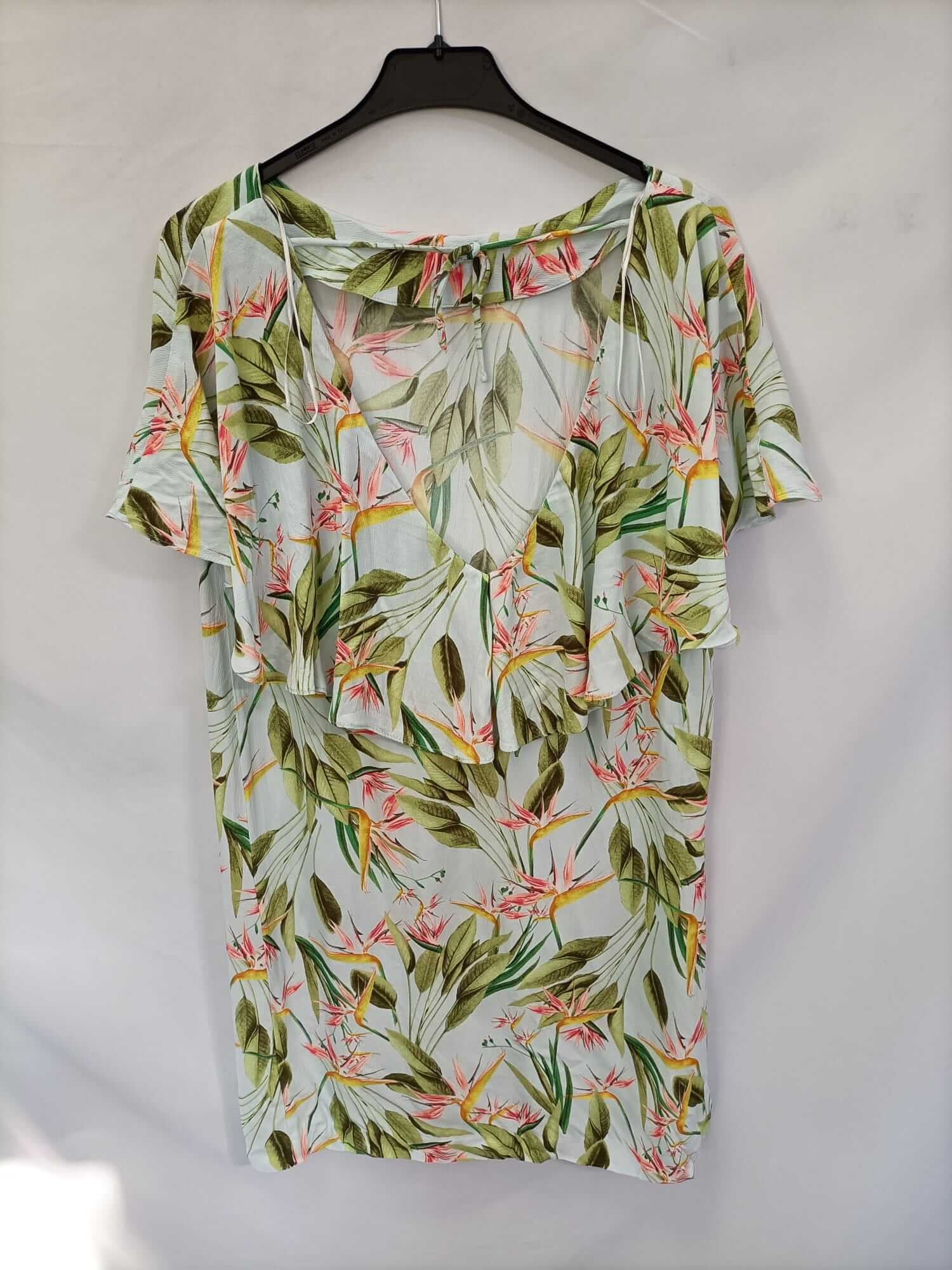 Zara. Xs. Vestido corto azul celeste con estampado de hojas. Espalda al aire con volante y lazada. No elástico. De sisa a sisa 50 cm largo 85 cm