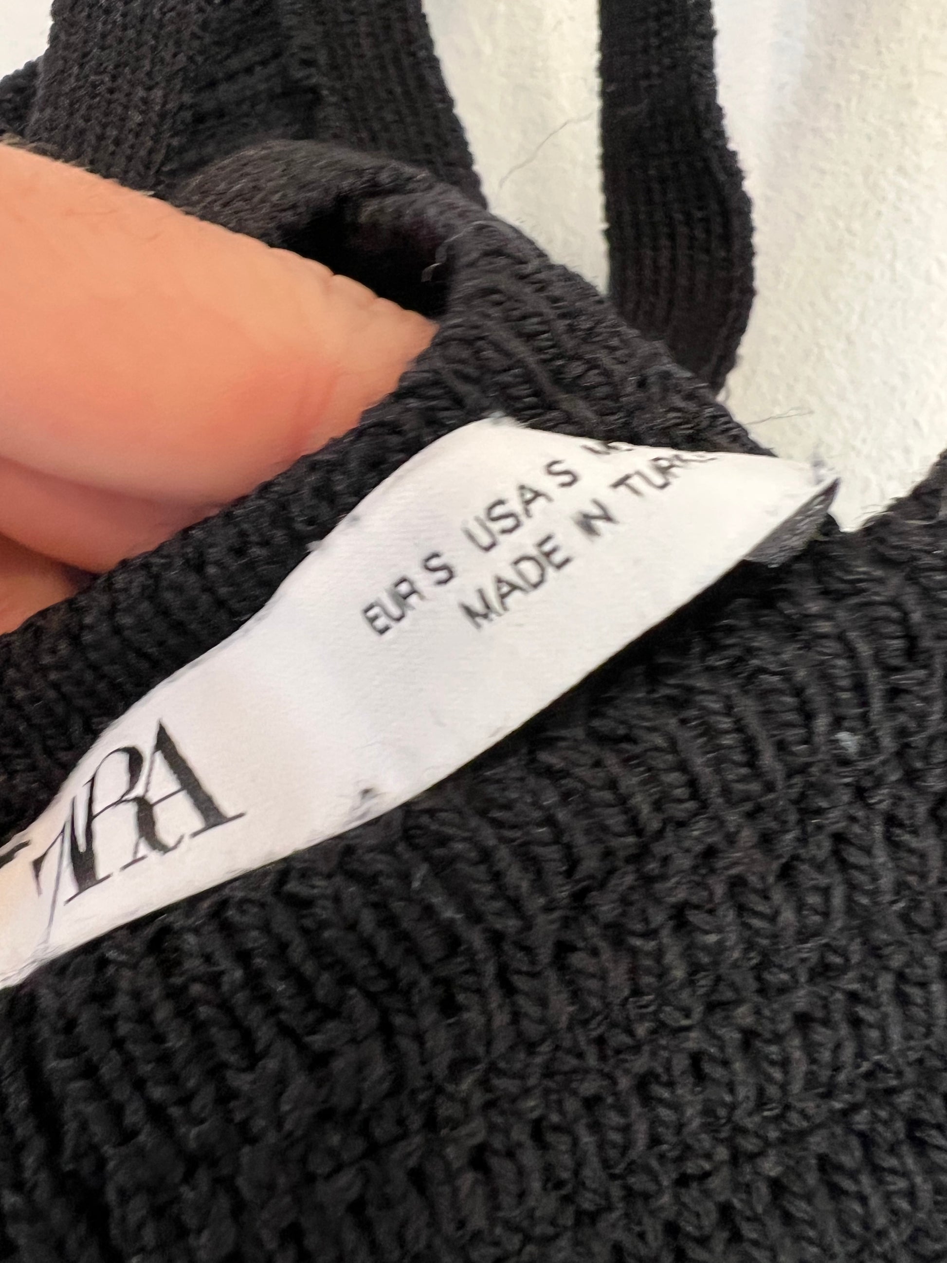 Vestido corto negro troquelado con escote de punto. No lleva forro.