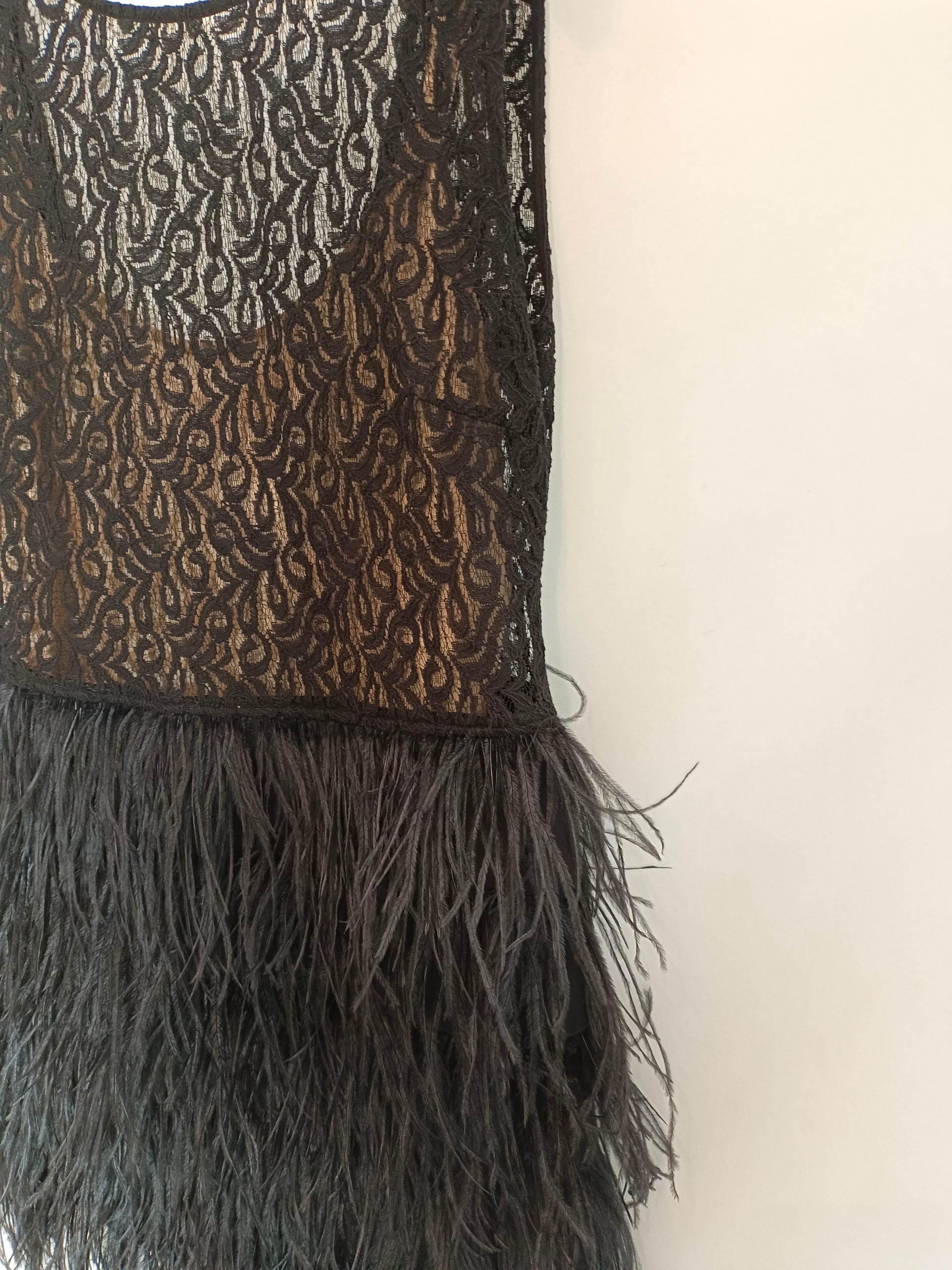 Vestido corto negro de encaje en la parte de arriba y falda de plumas.