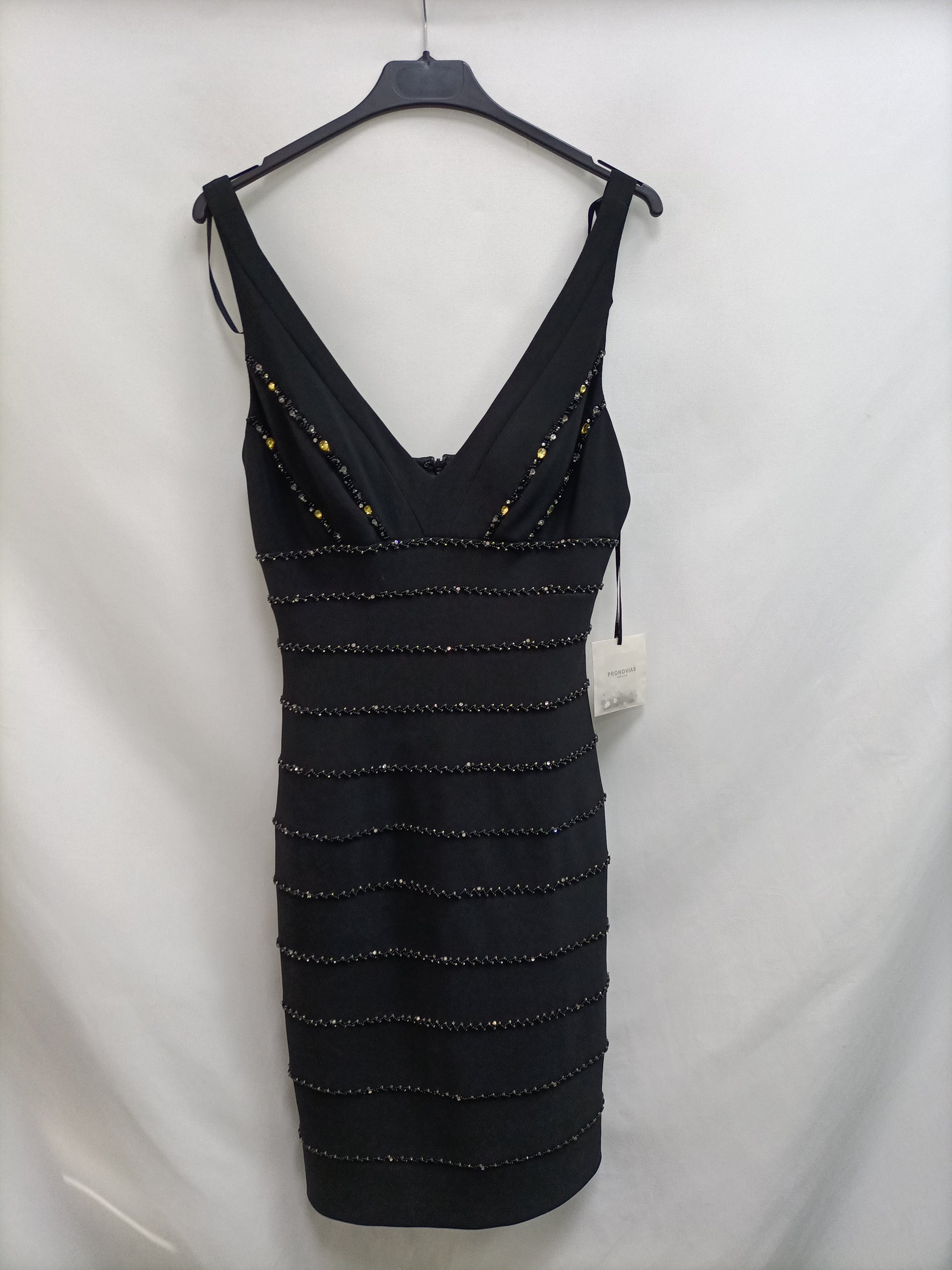 NUEVO CON ETIQUETA.Vestido corto negro elástico ajustado con detalle de pedrería