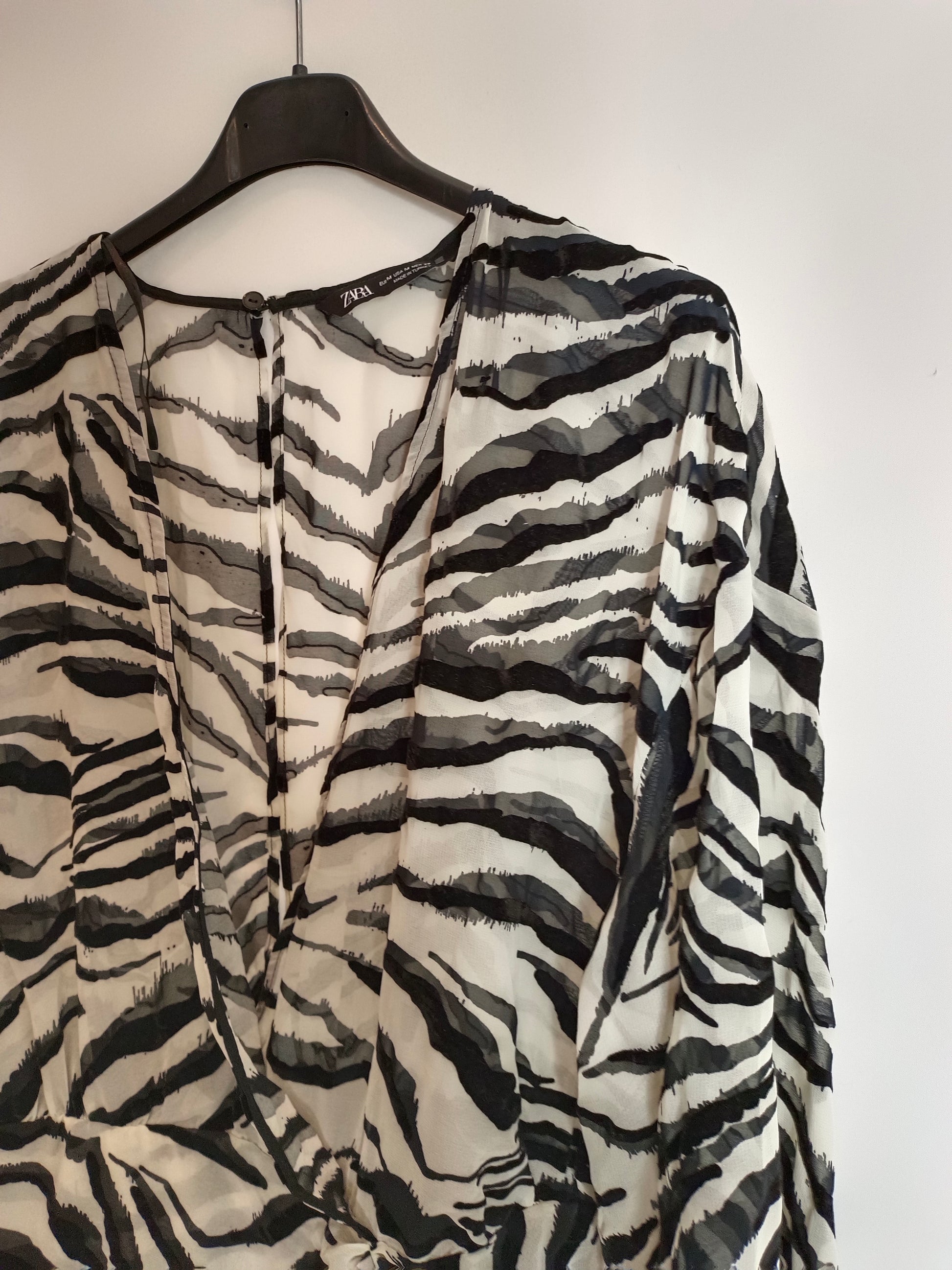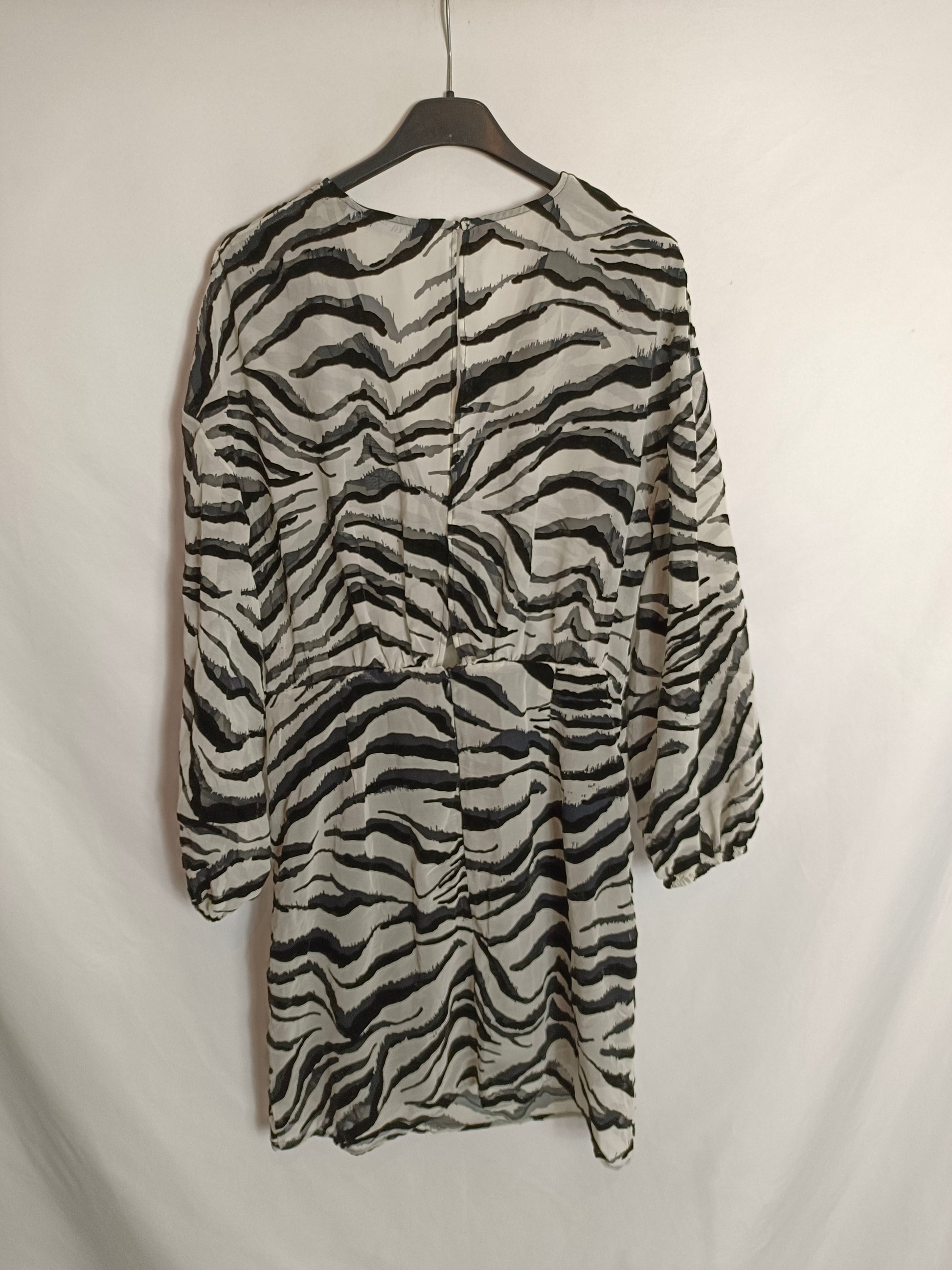 vestido corto gris con estampado animal print. Escote cruzado y detalle de terciopelo.