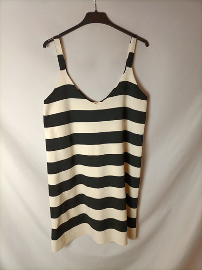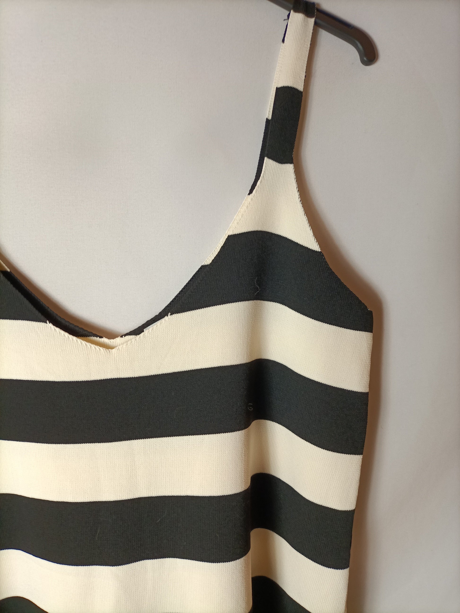vestido corto negro y blanco de rayas de tejido tipo punto. elástico.