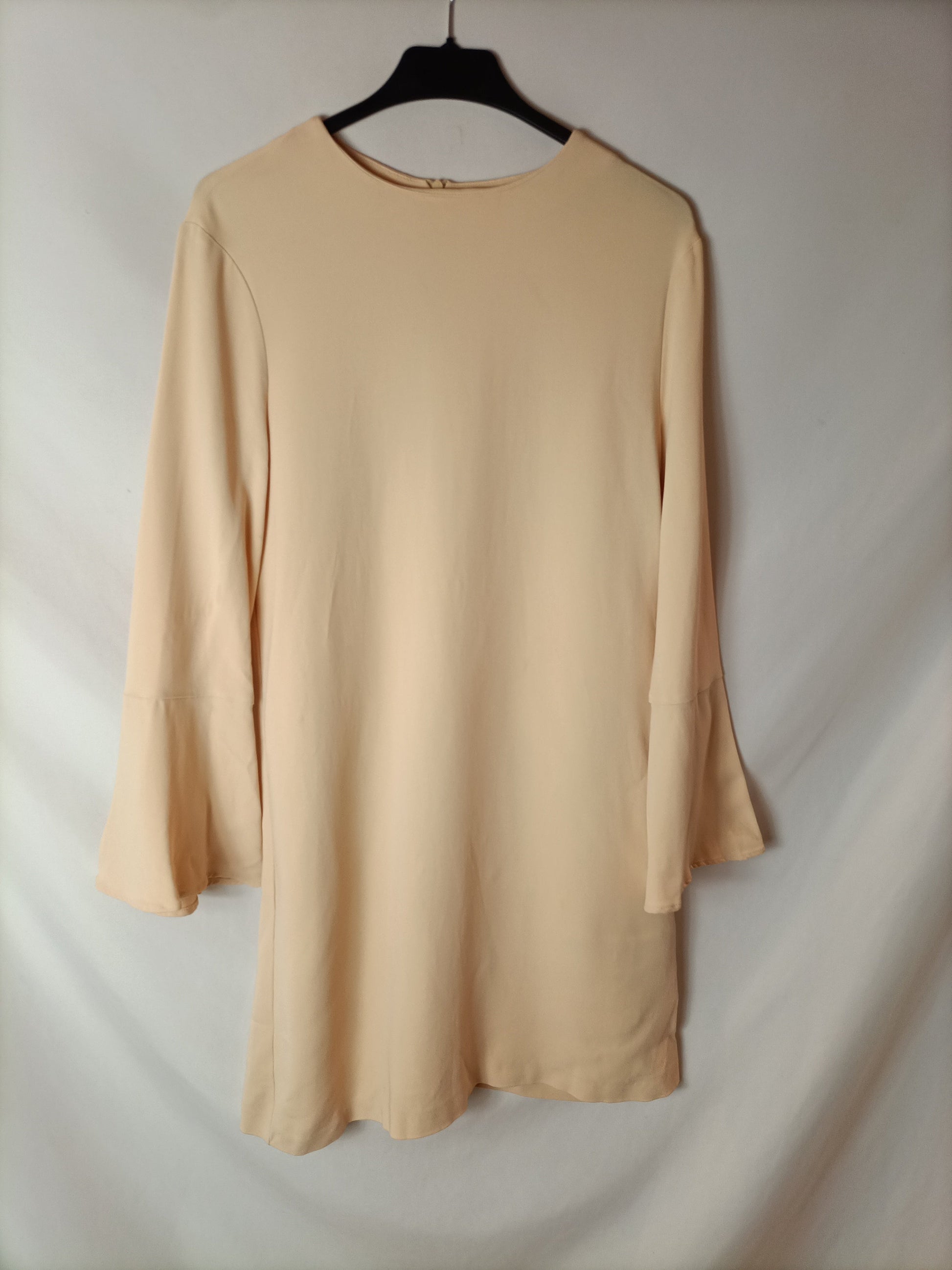vestido corto rosa palo de corte recto. no elástico. La manga acaba en volante