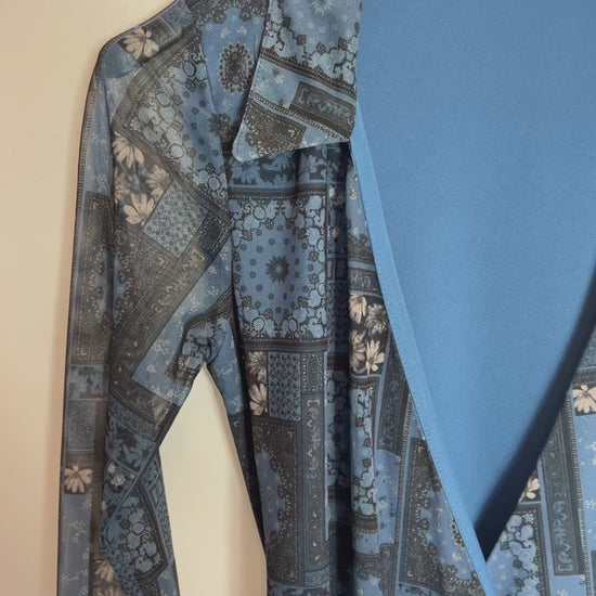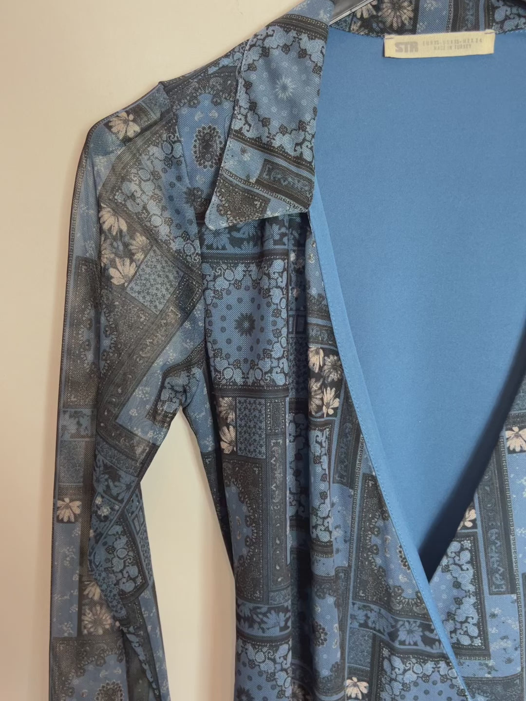 Vestido cruzado azul estampado manga semi transparente. Elástico