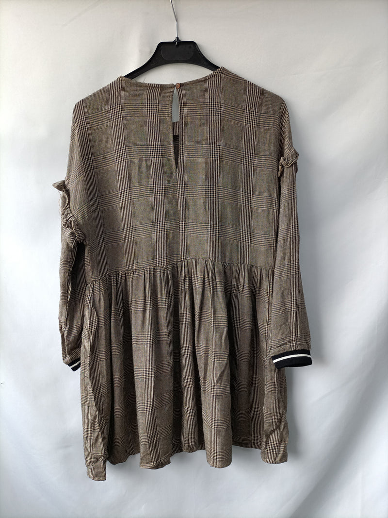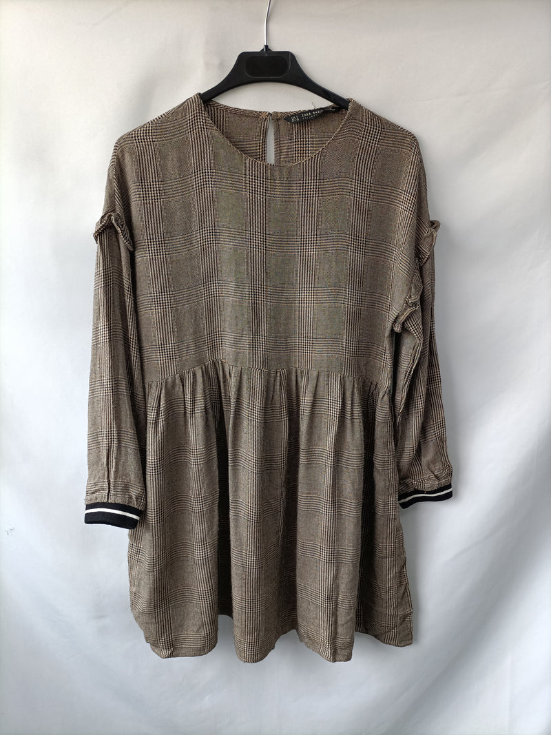 Vestido fluida de cuadros y pata de gayo, tiene un volante en las mangas. No es elástico. De sisa a sisa 48 largo 79 cm
