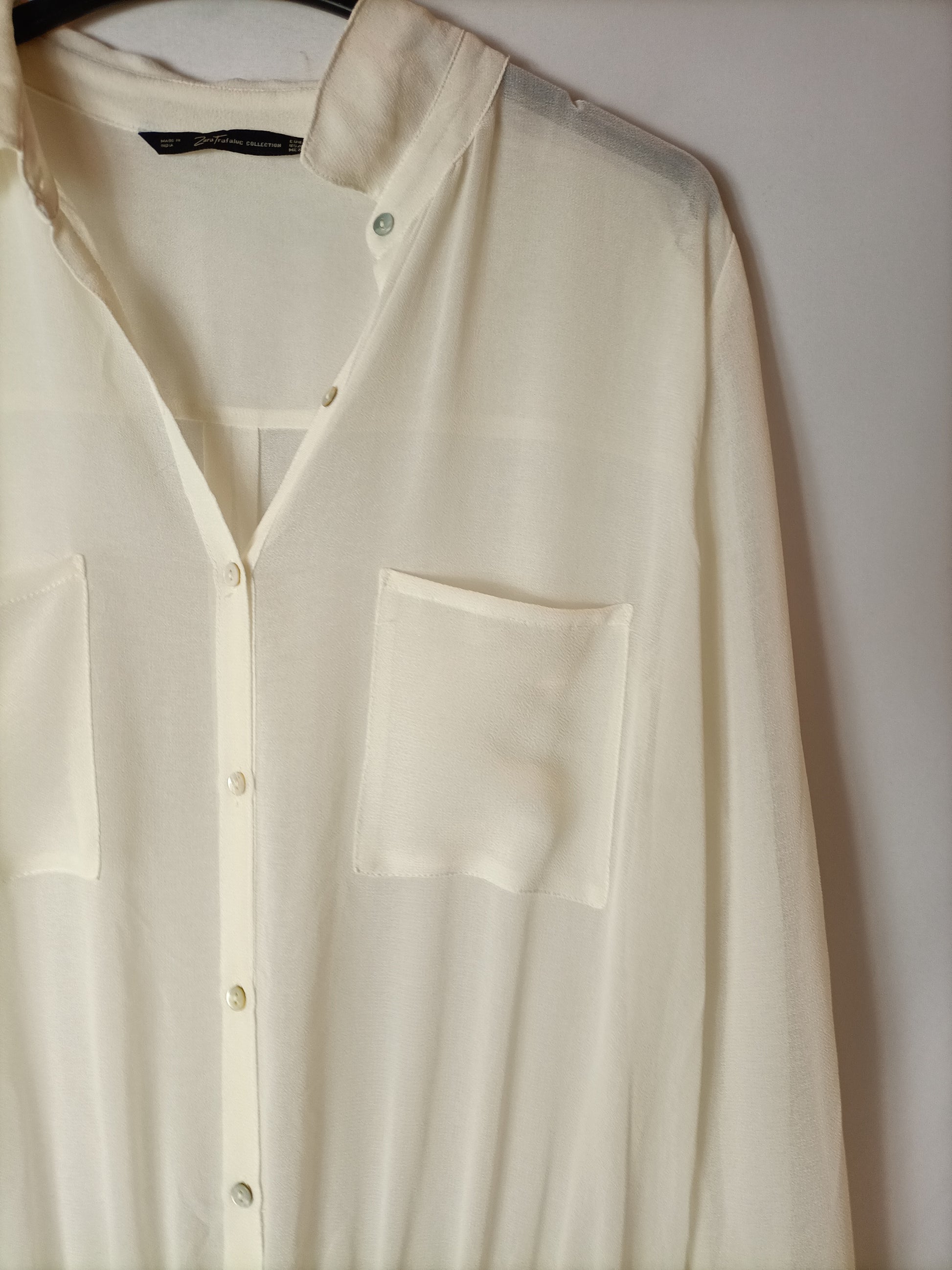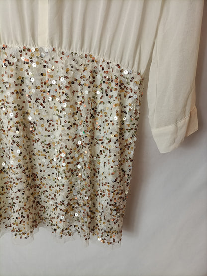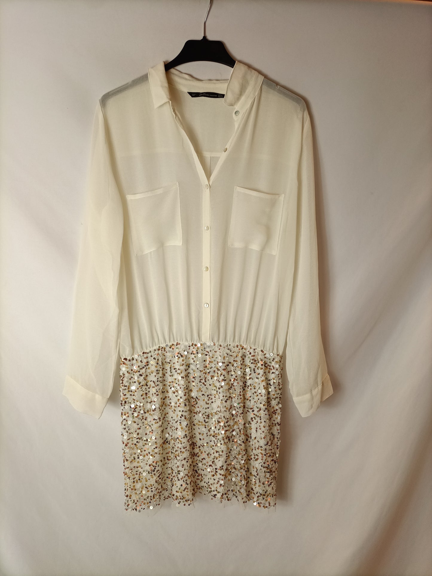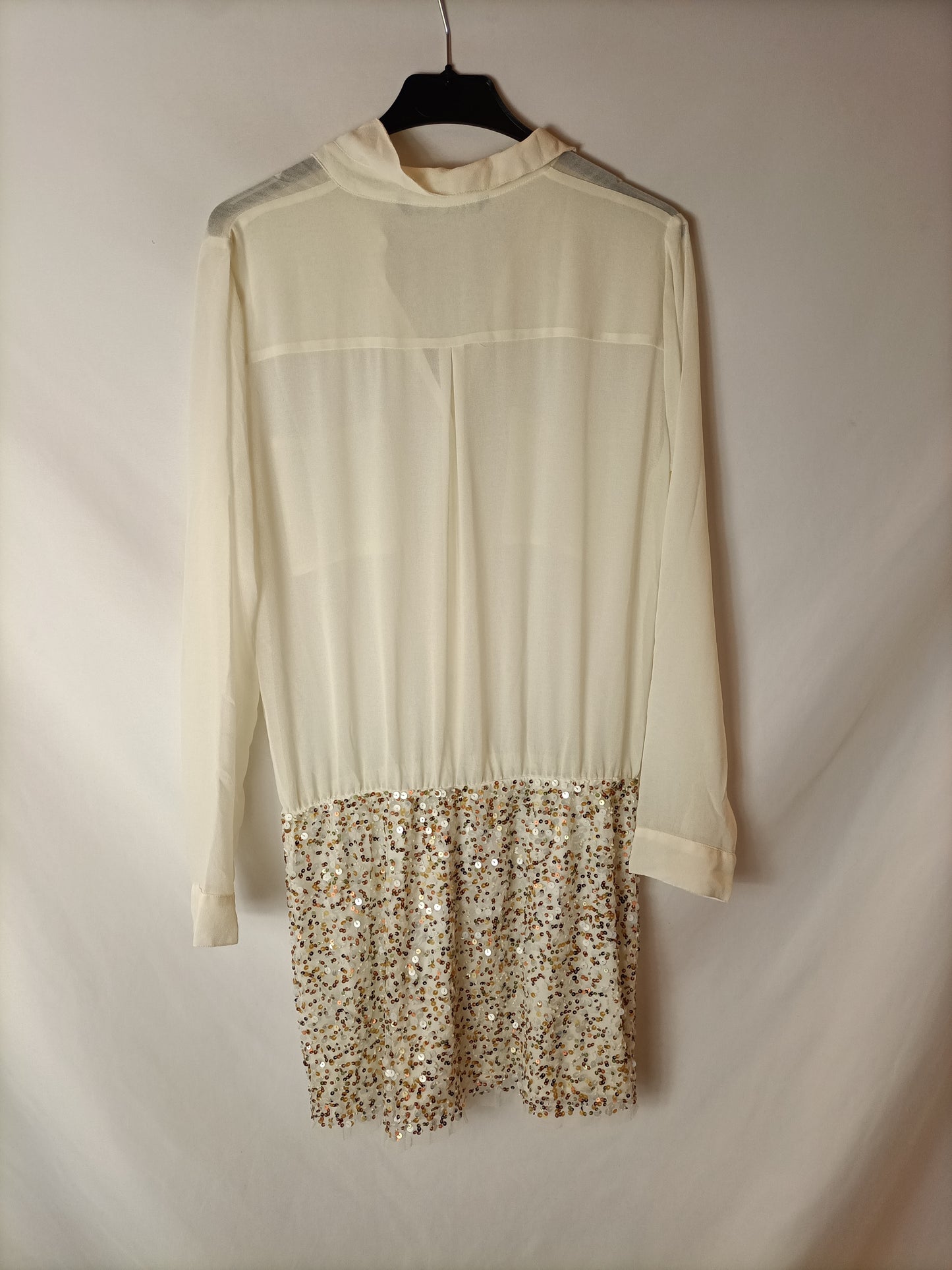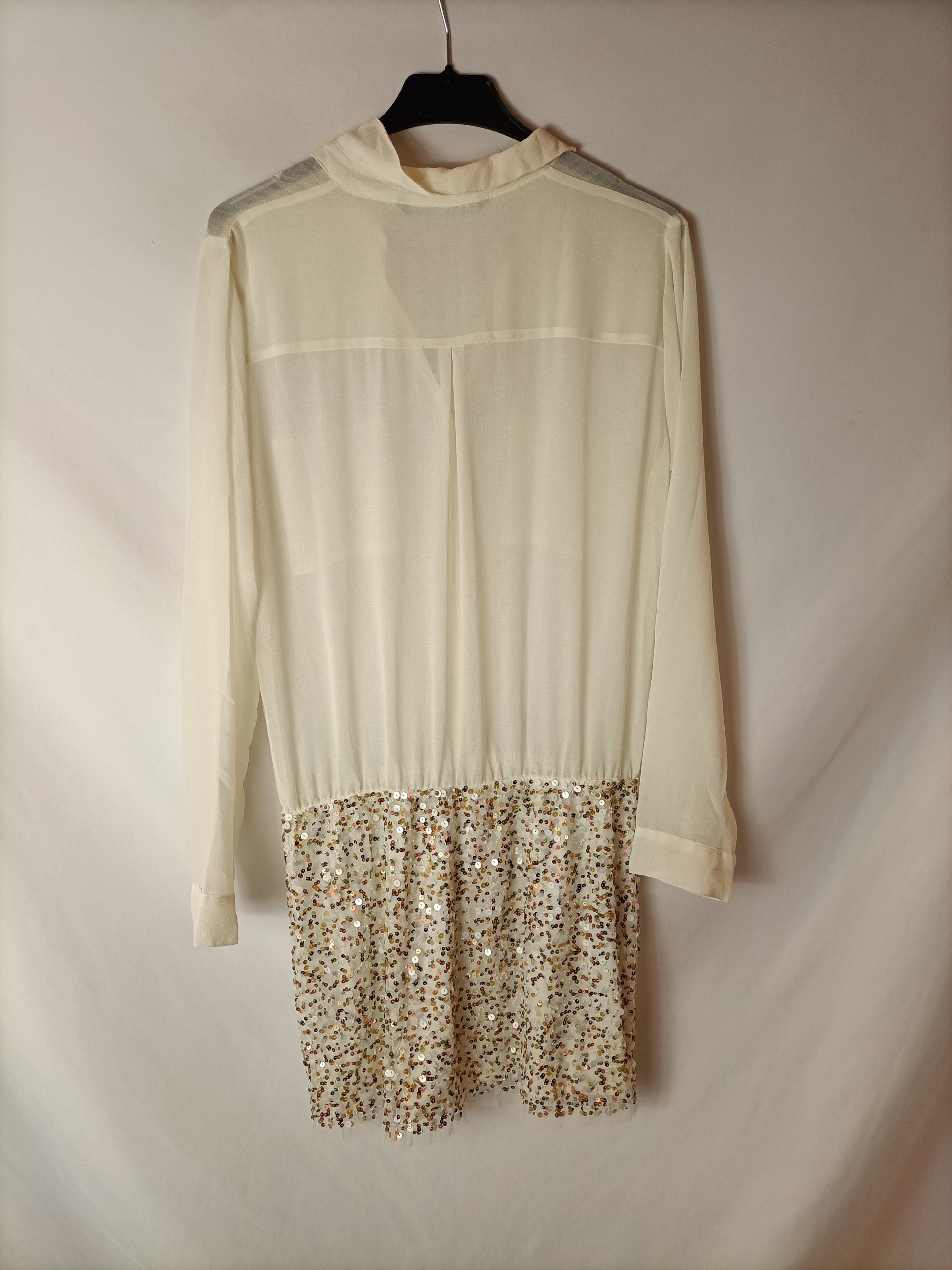 vestido corto blanco roto con la falda de lentejuelas y parte de arriba tipo blusa semitransparente. de sisa a sisa 48 cm