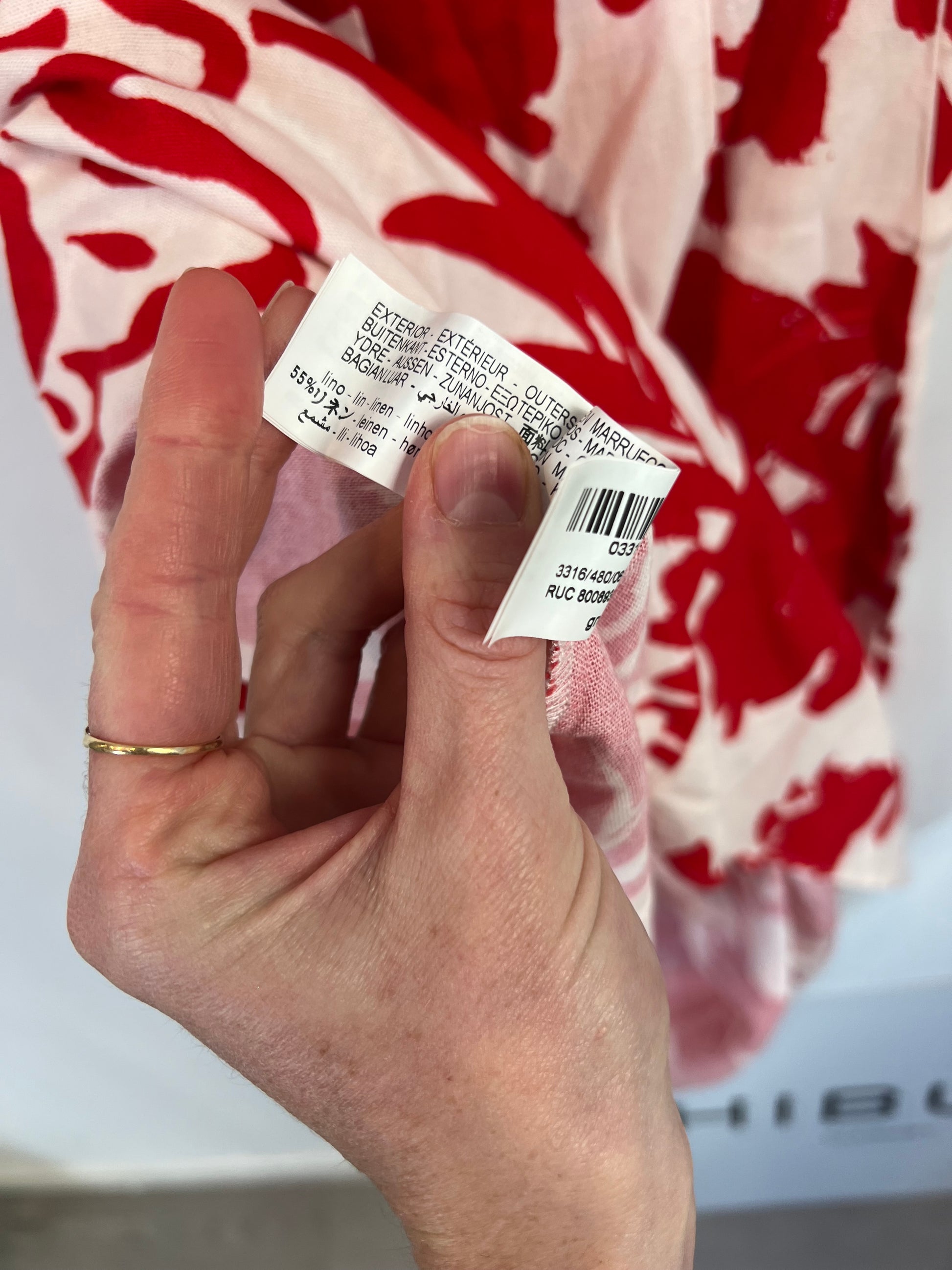vestido midi de flores beige y rojo con lino. Atado al cuello. de sisa a sisa 40 cm largo 105 cm.