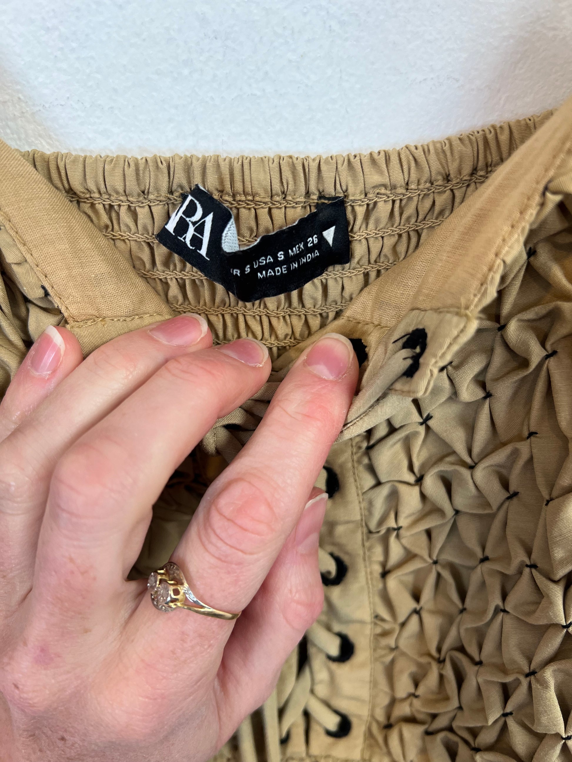 Vestido lago beige con escote de nido de abeja elástico. largo 115 cm.