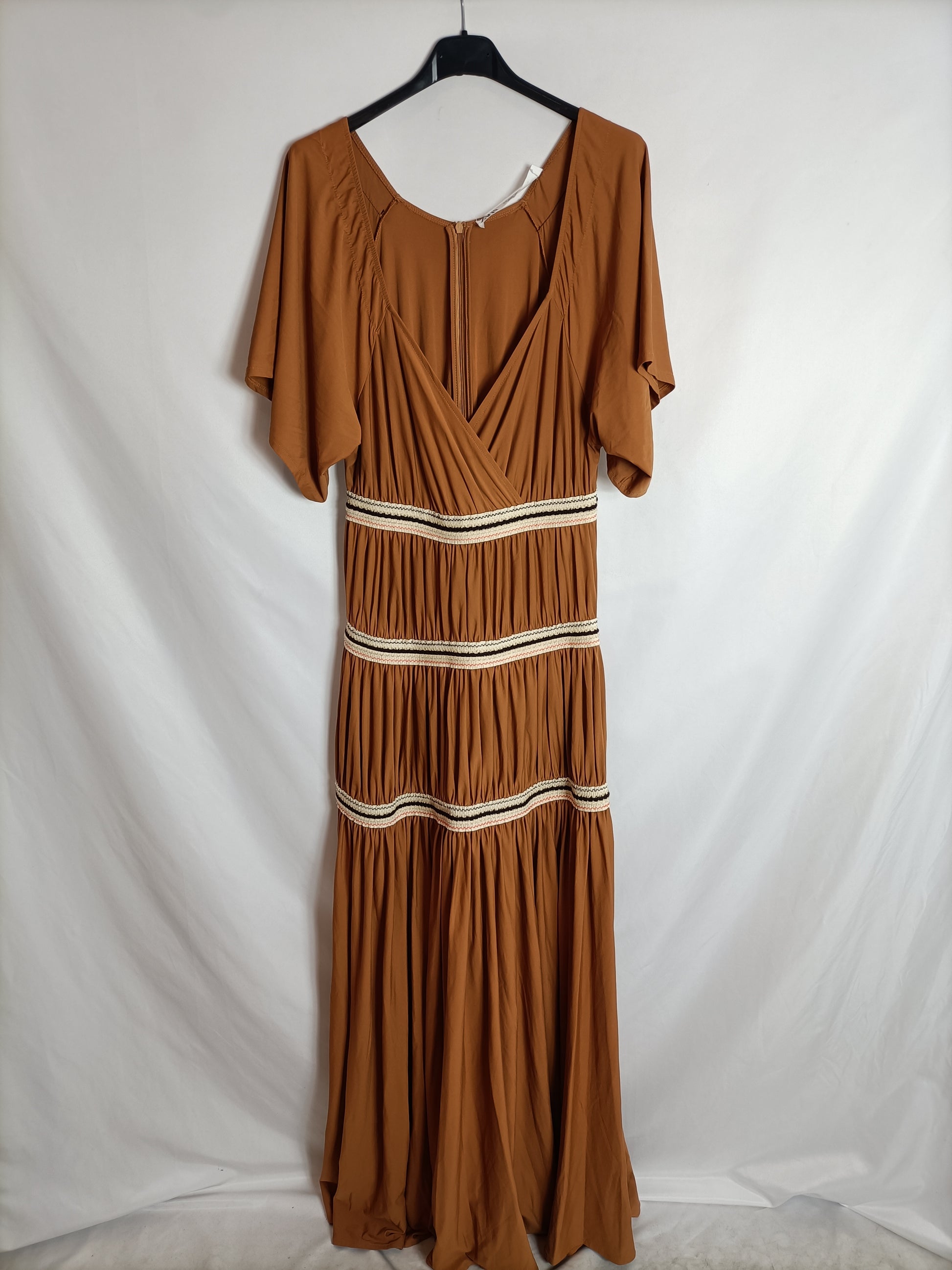 Vestido largo camel de tejido tipo licra con detalle étnicos efecto volante. elástico.