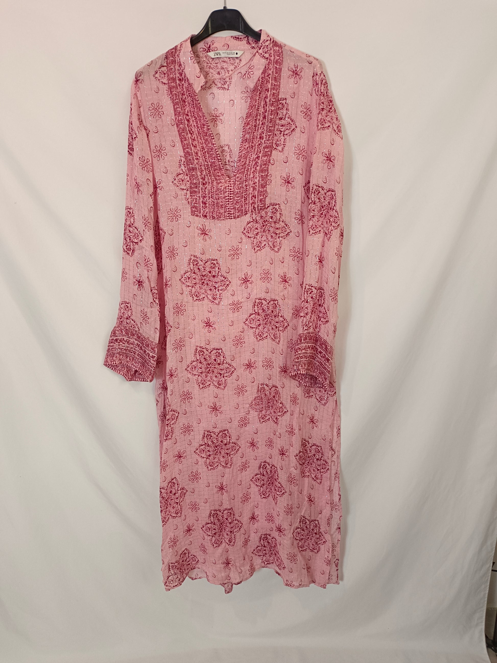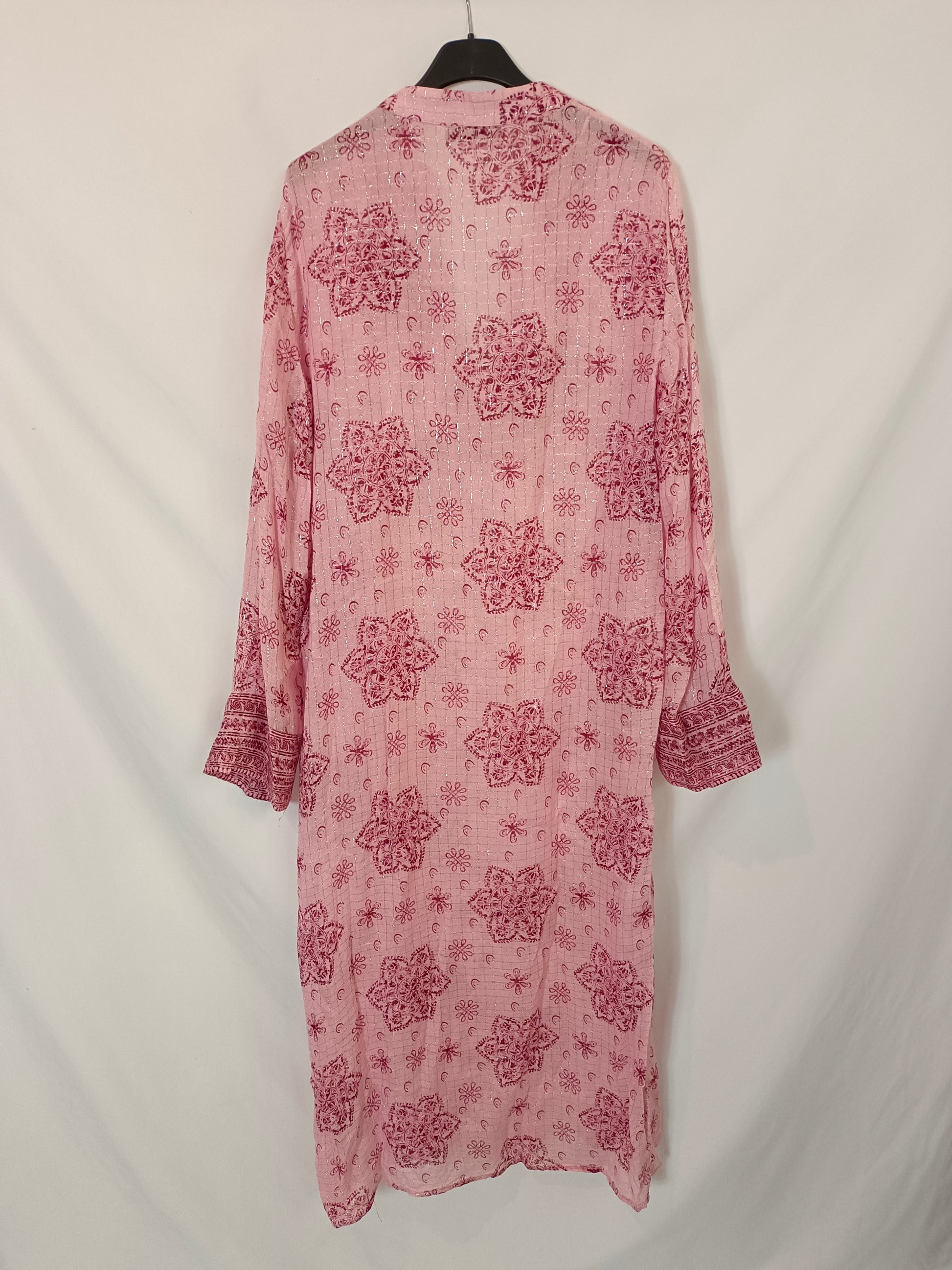 vestido largo rosa estampado con detalle de hilos metálico. Aberturas laterales fino y ligeramente transparentoso.