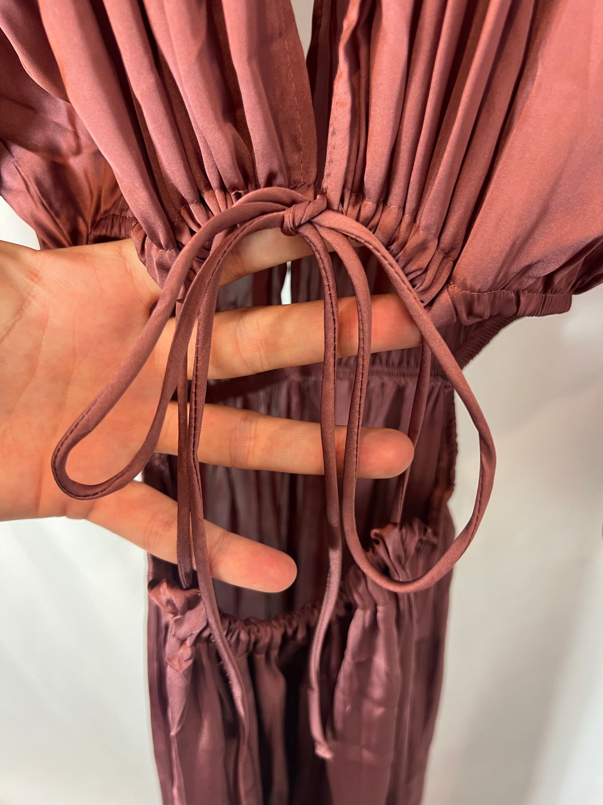 Vestido largo satinado aperturas tono malva y anudado en la espalda