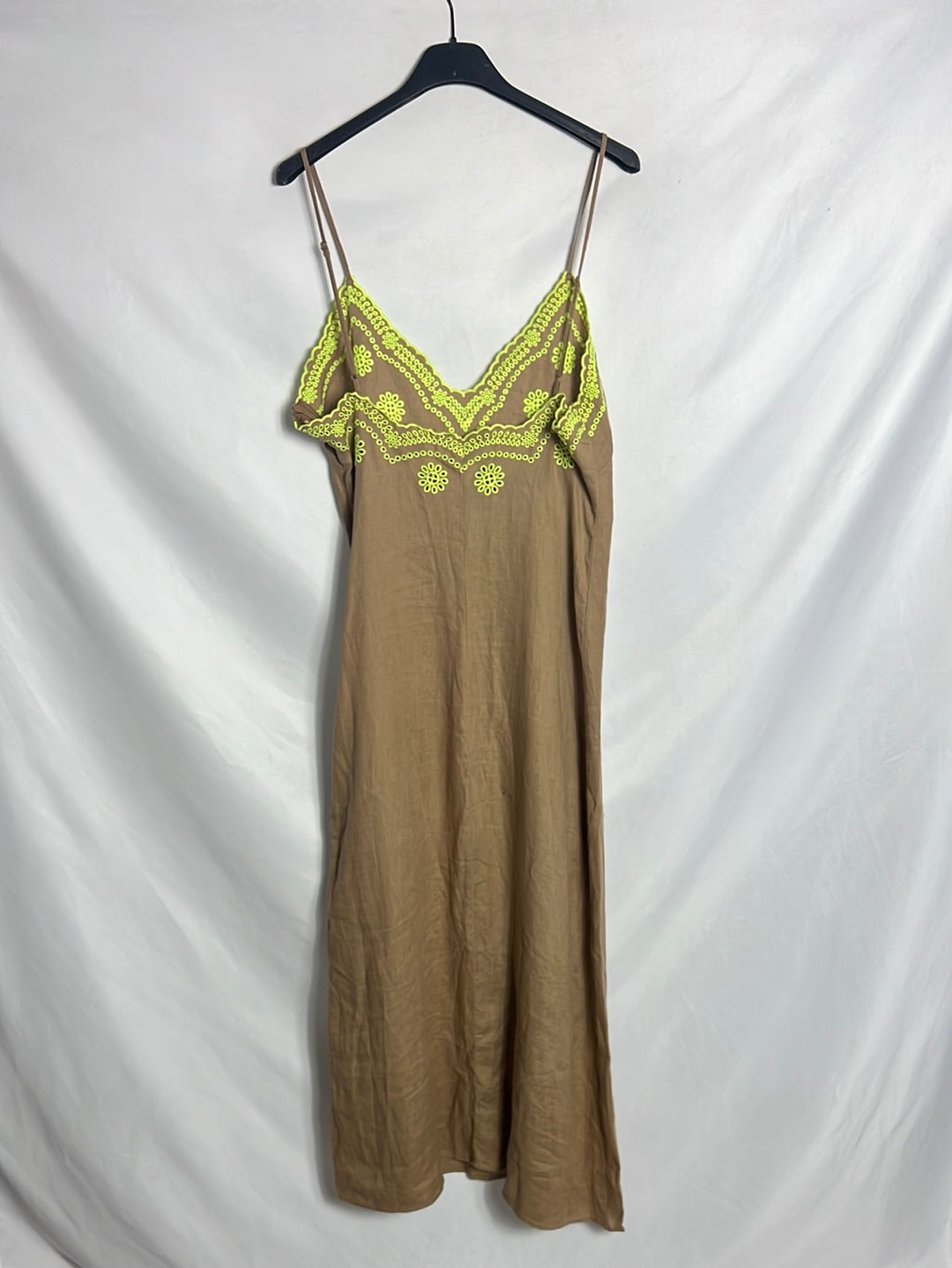 vestido midi beige con flores bordadas 100%lino. Tara:mini mancha en la parte trasera. Largo 124cm, de sisa a sisa 45cm