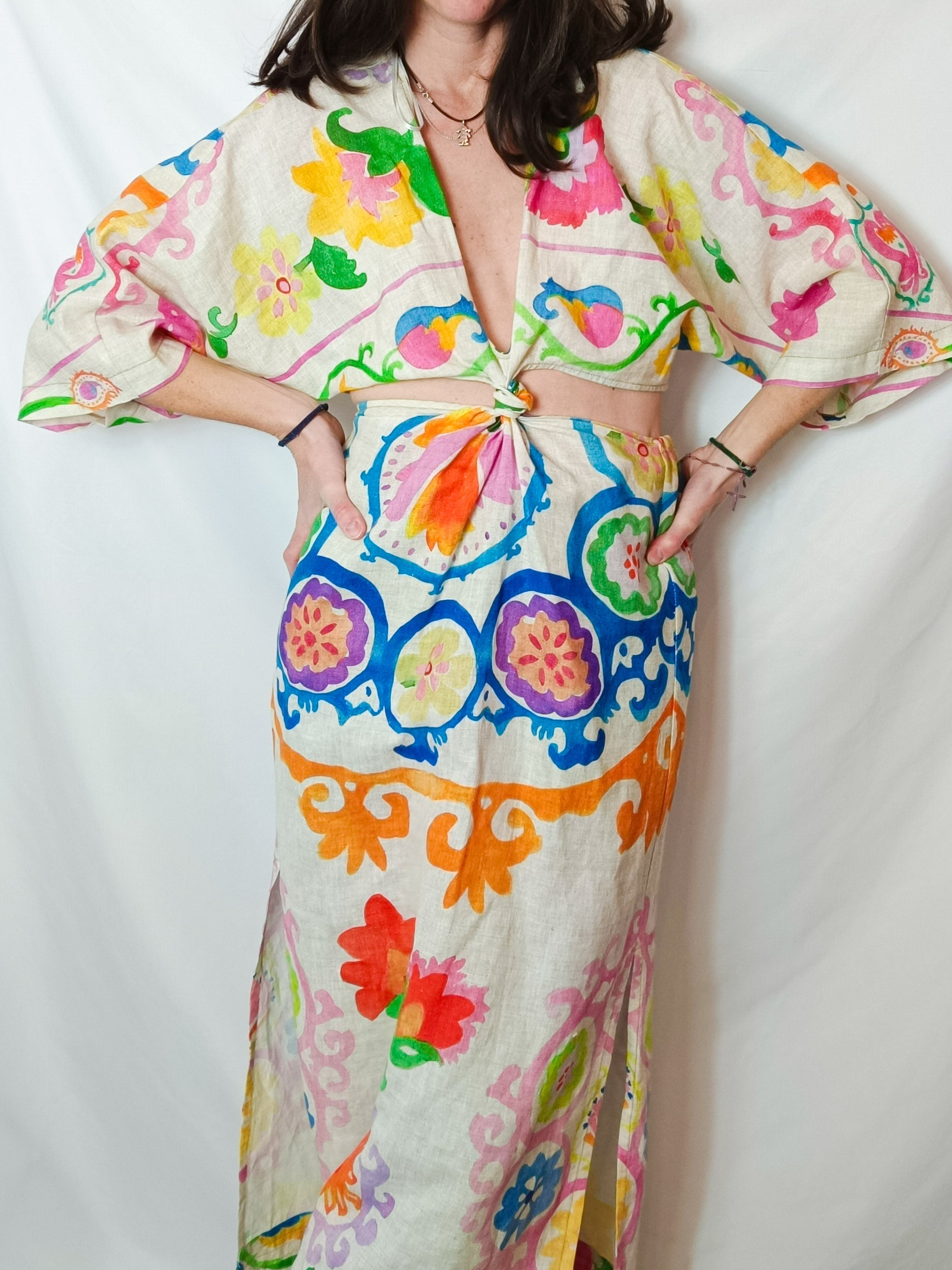 NUEVO CON ETIQUETA. Vestido lino aperturas estampando . cintura 36cm, largo 89cm