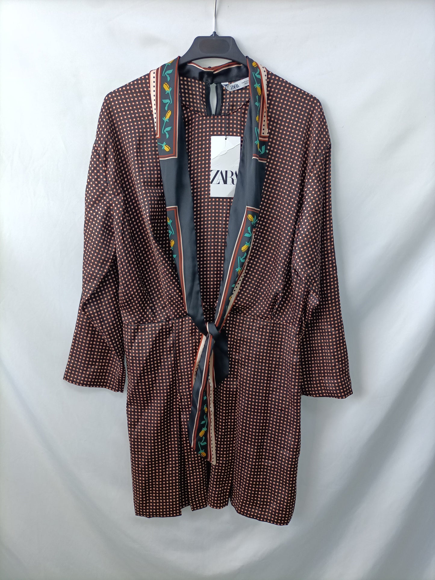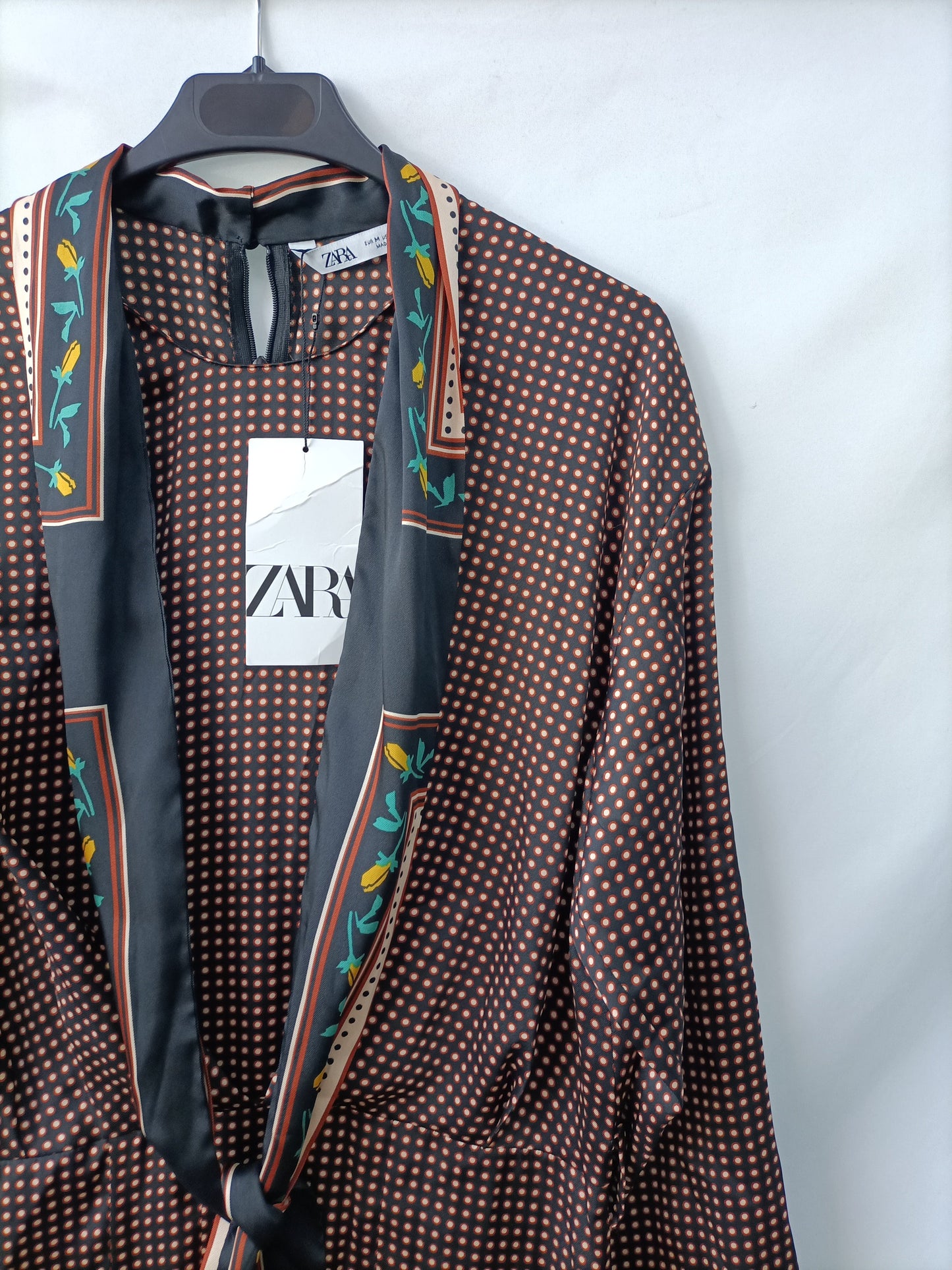 Zara. NUEVO CON ETIQUETA. Vestido negro con lunares en tono beige y teja. Pinzas en la cintura y lazada en el cuello. No elástica. De sisa a sisa 57 cm largo 52 cm