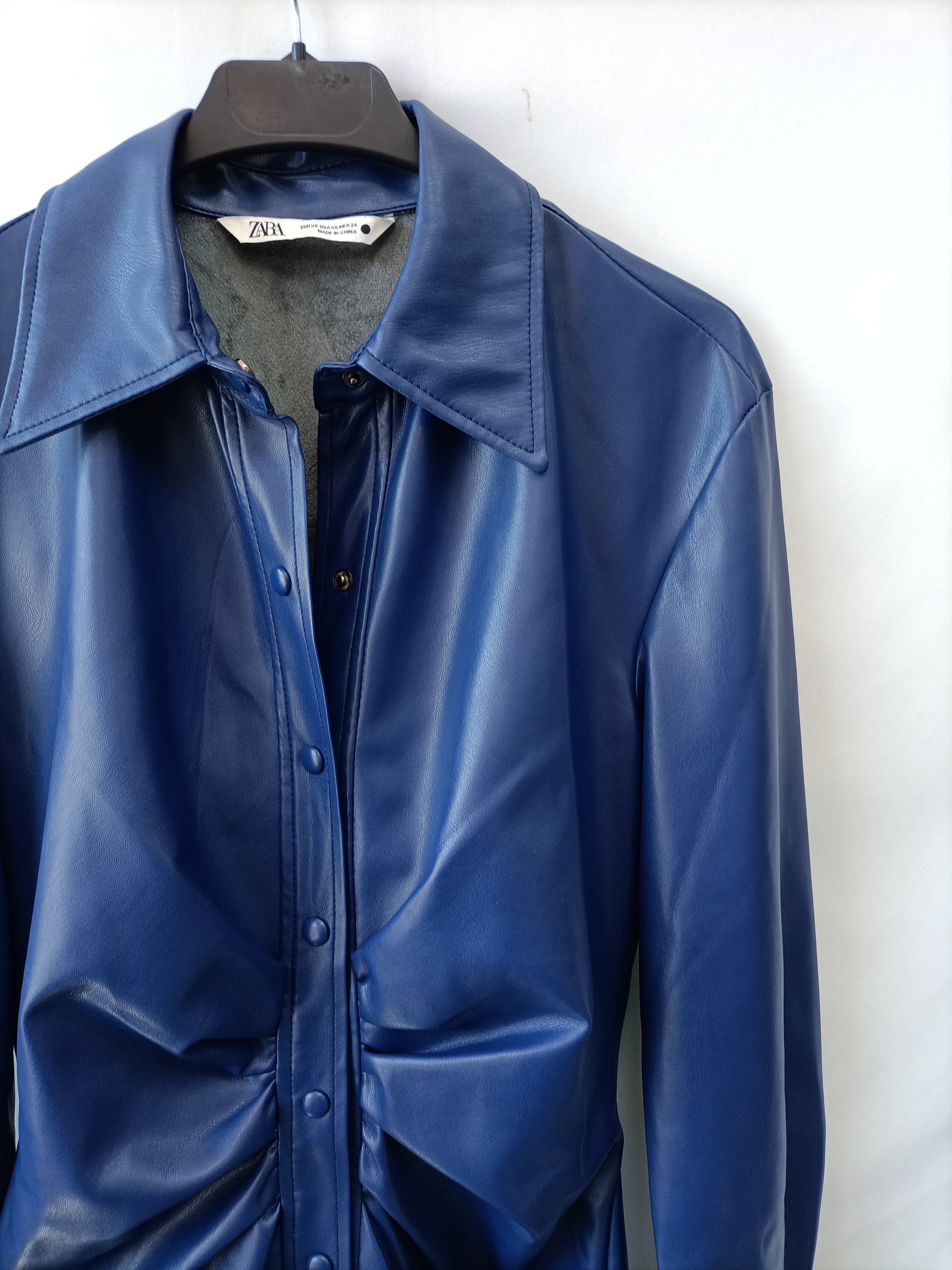 ZARA.Vestido midi azul polipiel T.XS