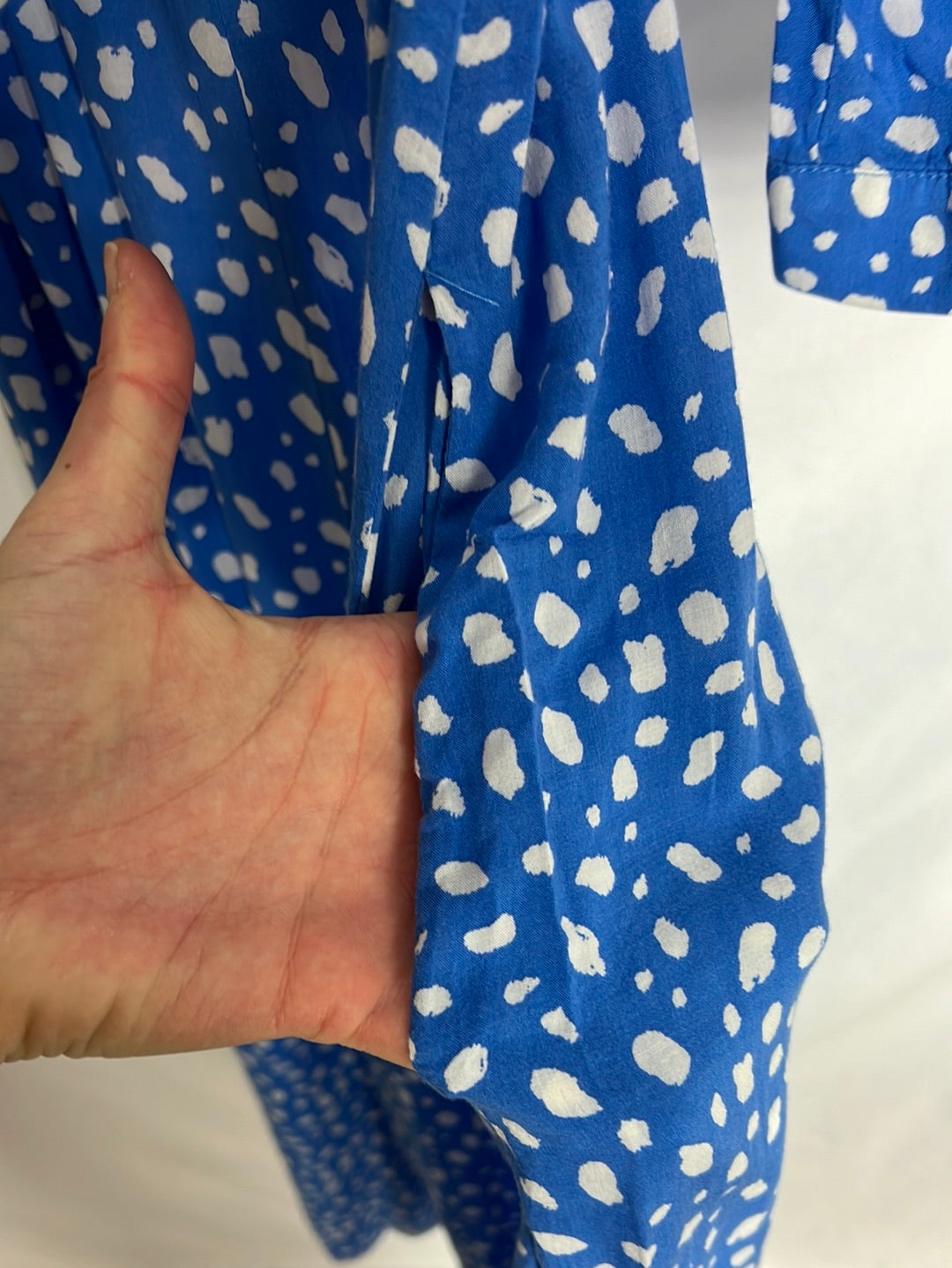 vestido azul fluido con estampado en blanco. cinturón de lazada. largo 120cm
