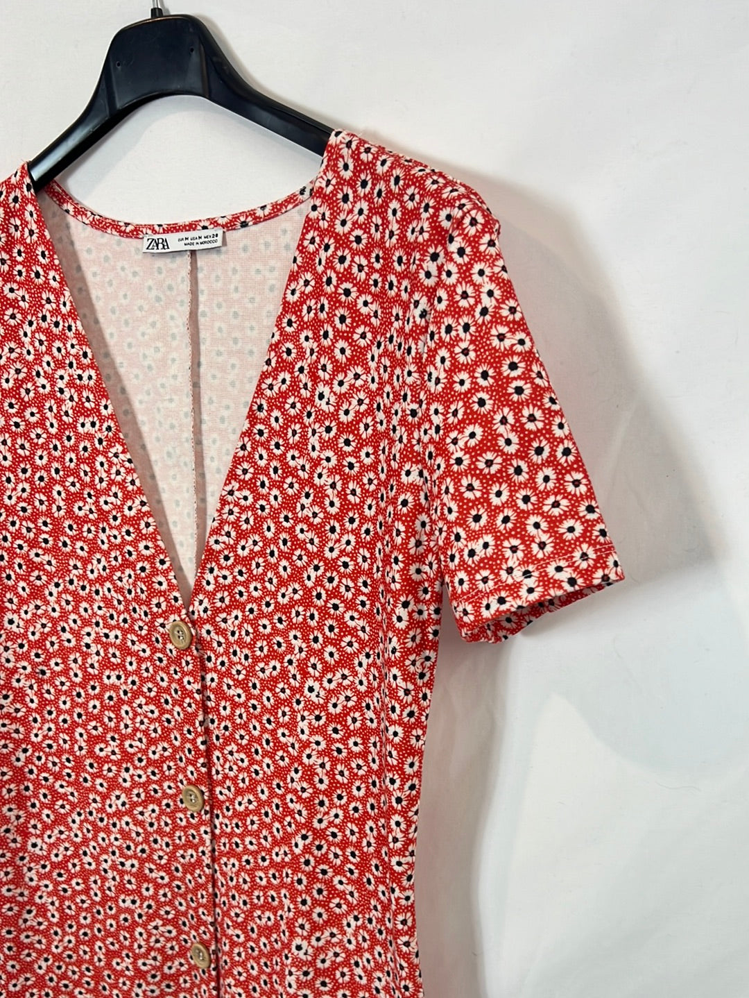 Vestido midi rojo abotonado con estampado de flores. Elástico . Cintura 35cm, largo 99cm