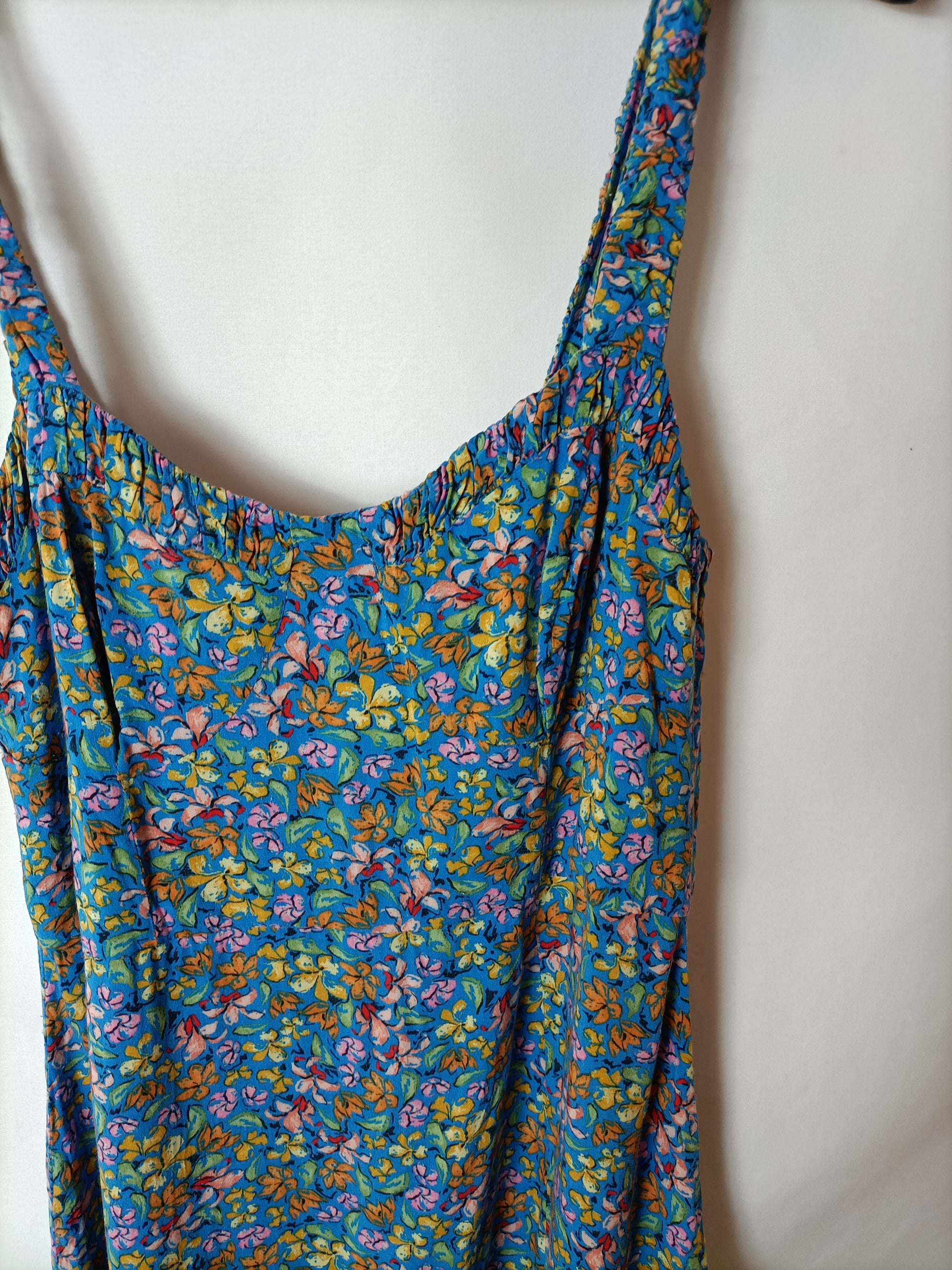 vestido midi azul con flores de colores. apertura en la parte de abajo. de sisa a sisa 40 cm largo 114 cm