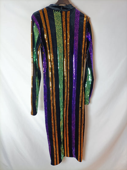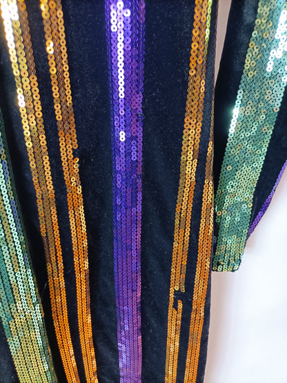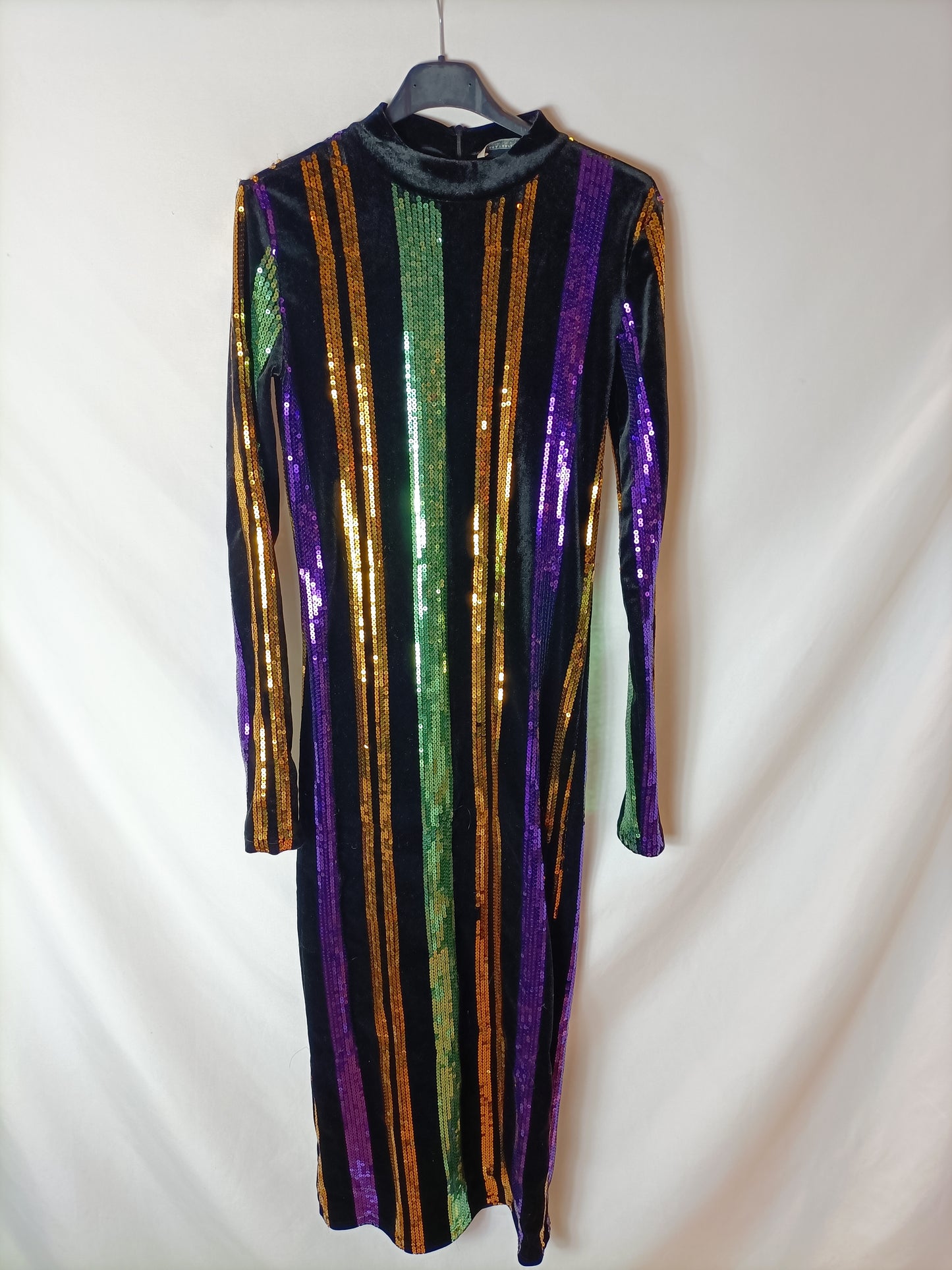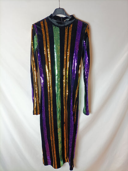 Vestido midi de terciopelo negro con rayas de lentejuelas. Elástico. Le faltan mini lentejuelas