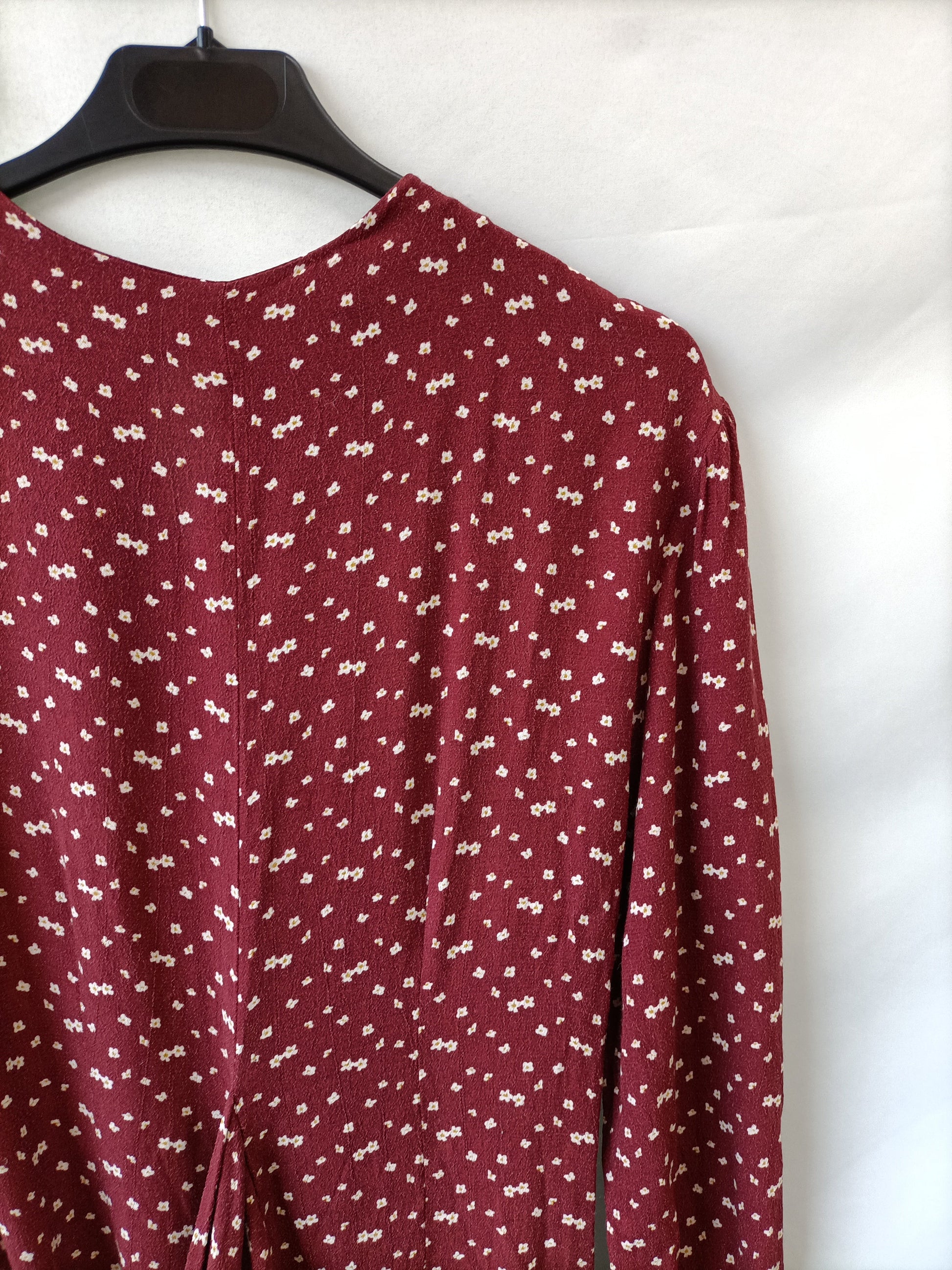 Zara. Vestido midi burdeos con detalles de florecitas y lazada lateral. No elástico. De sisa a sisa 41 cm largo 123 cm